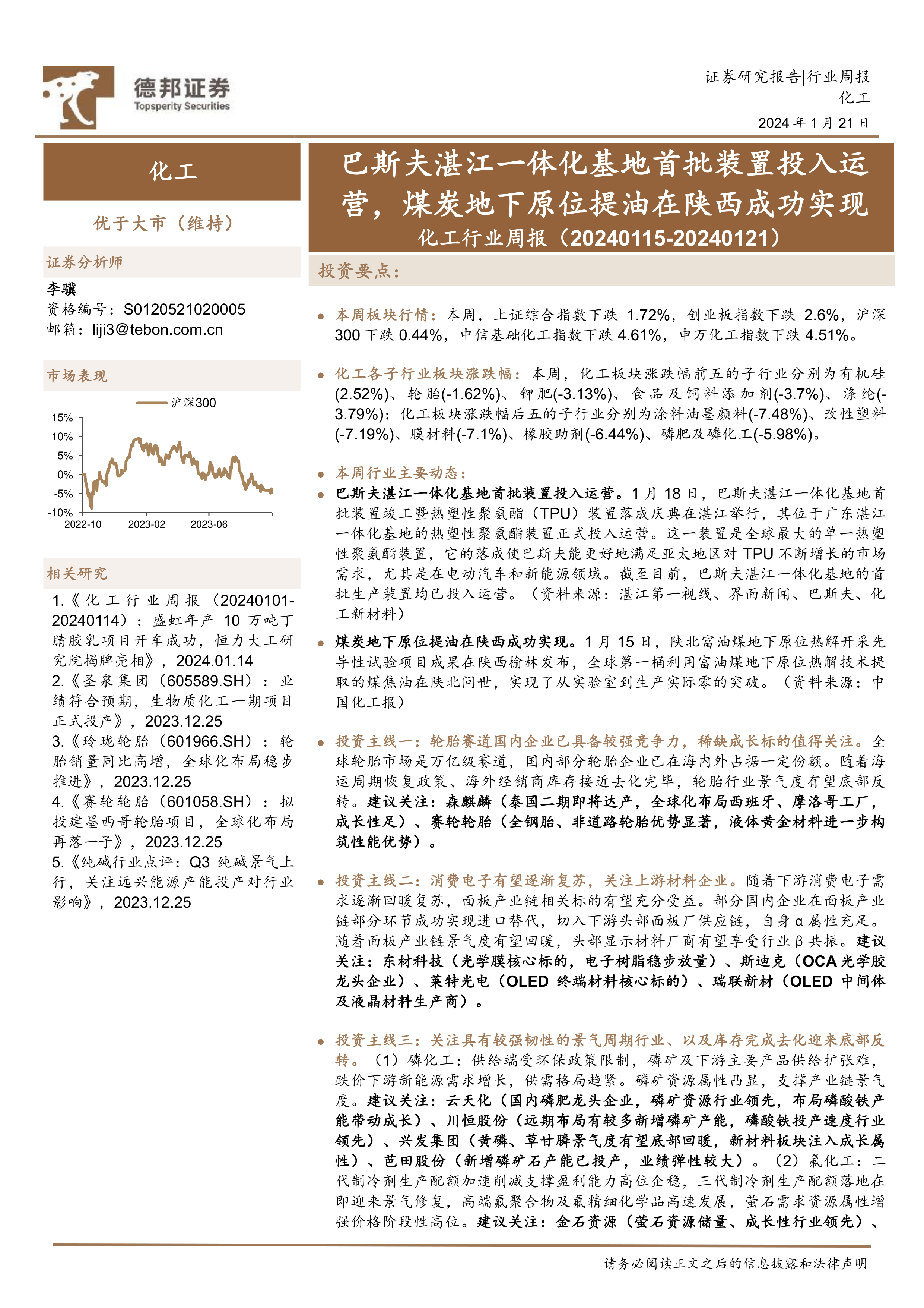 化工行业周报:巴斯夫湛江一体化基地首批装置投入运营,煤炭地下原位提油在陕西成功实现