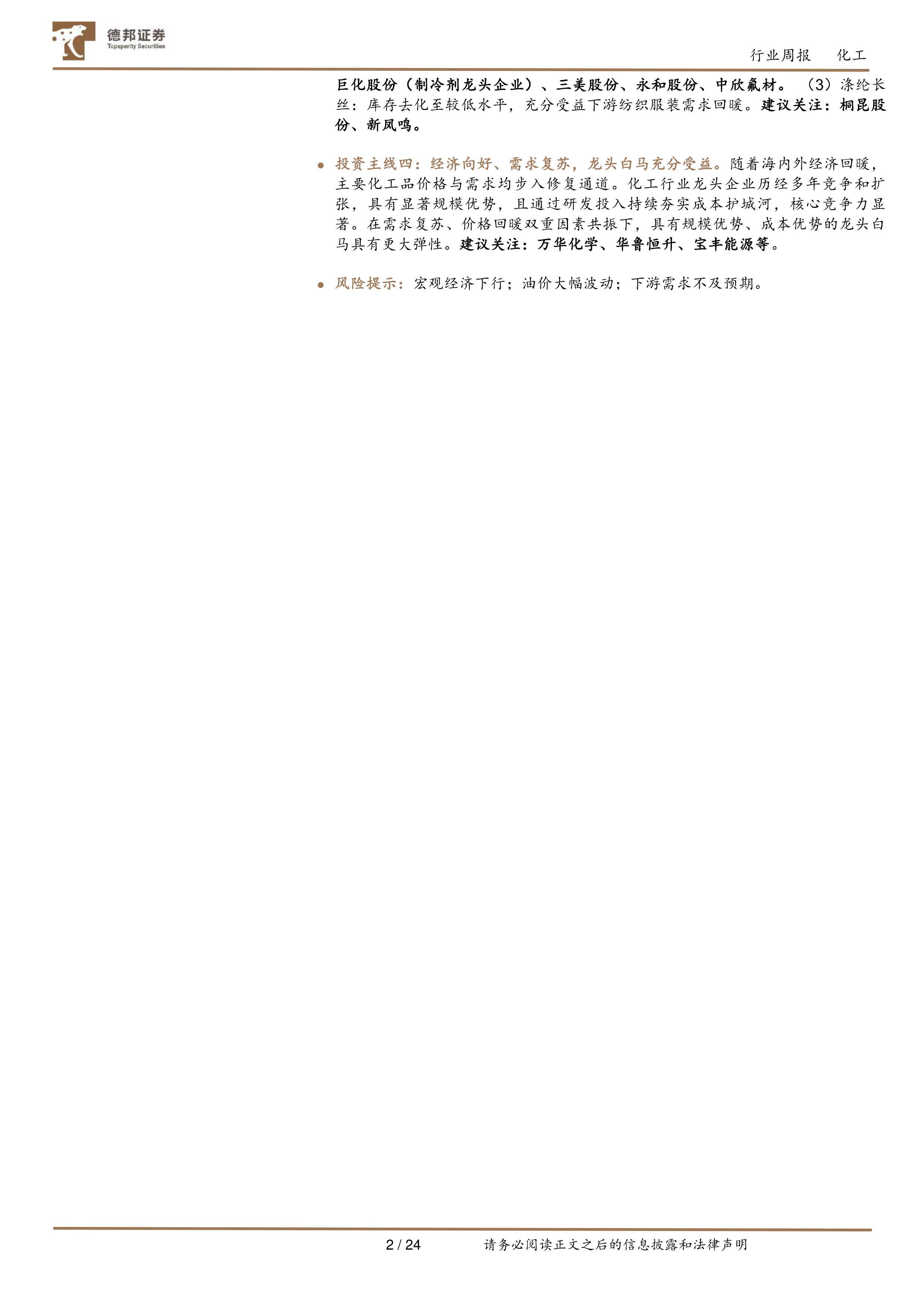 报告维持了化工行业“优于大市”的评级,并建议关注轮胎、消费电子上游材料、磷化工、氟化工、涤纶长丝等具有结构性增长潜力或处于周期底部反转的子行业,以及具备规模和成本优势的龙头白马企业。然而,投资者仍需警惕宏观经济下行、油价大幅波动以及下游需求不及预期等潜在风险。