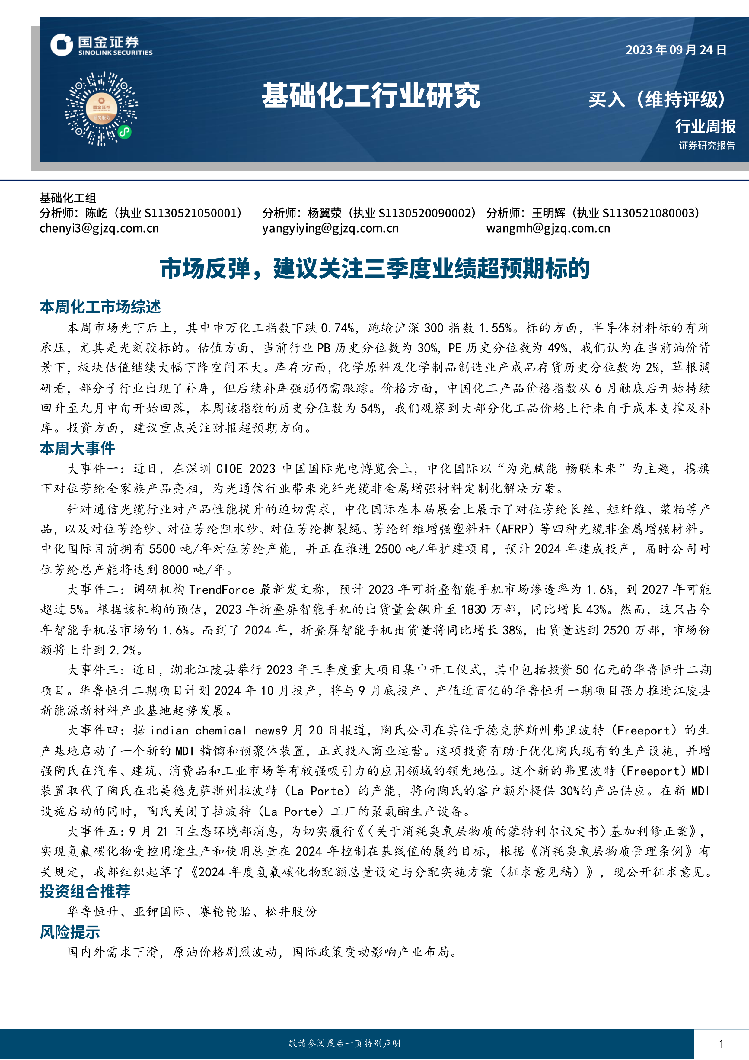 基础化工行业周报:市场反弹,建议关注三季度业绩超预期标的