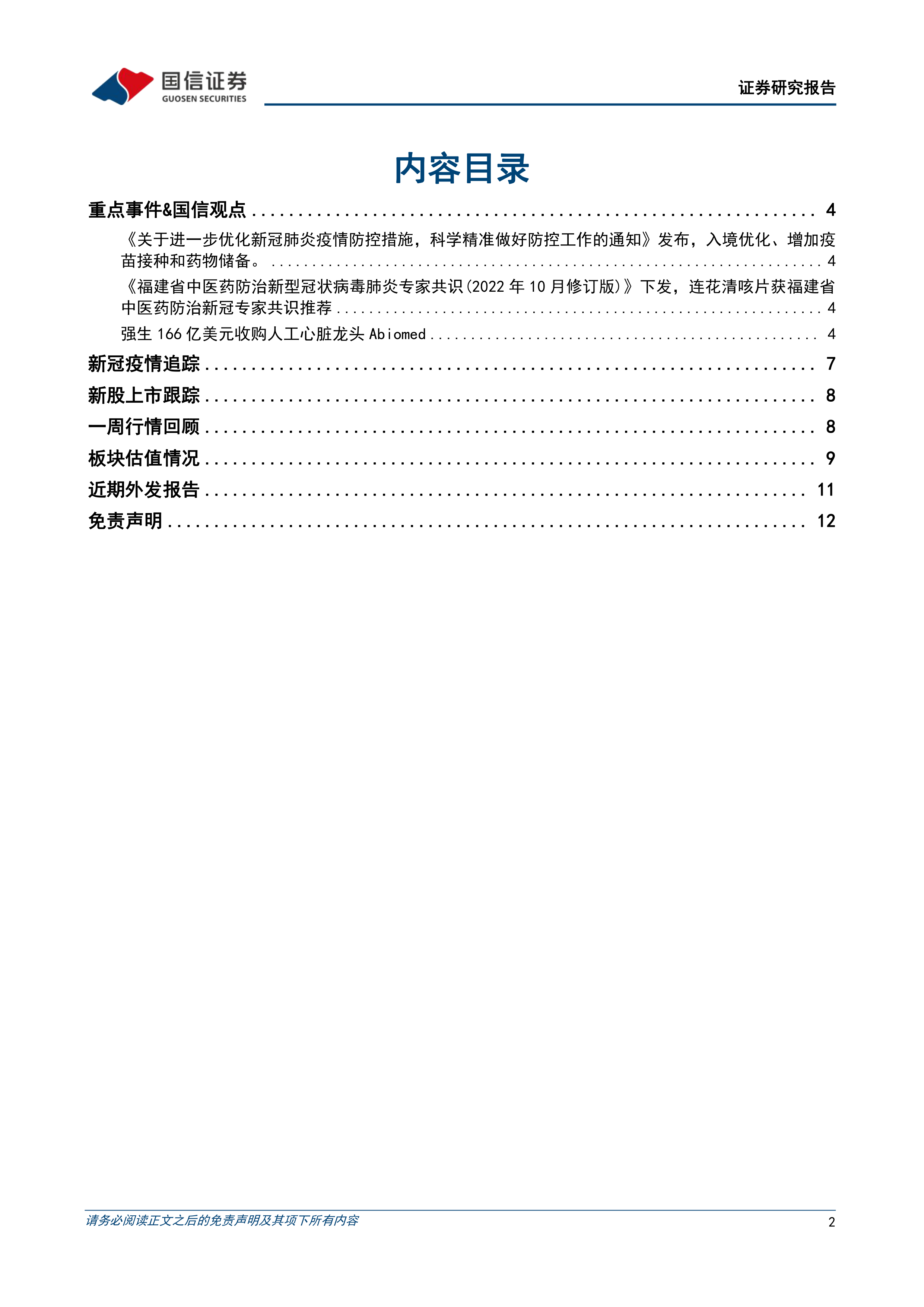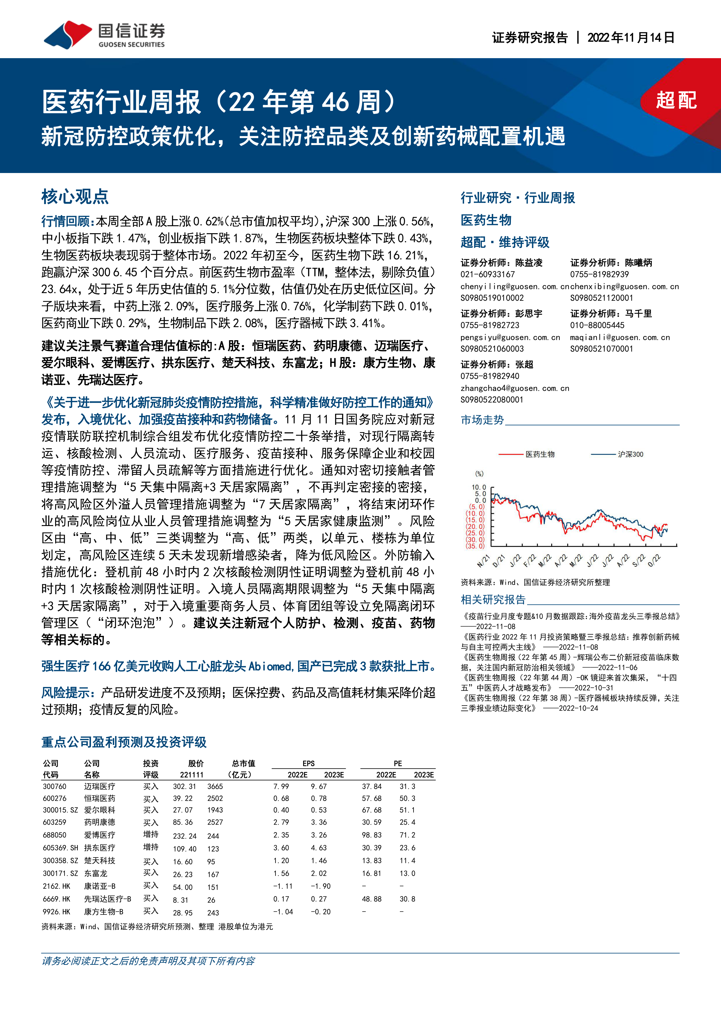 风险提示:产品研发进度不及预期;医保控费、药品及高值耗材集采降价超过预期;疫情反复的风险。