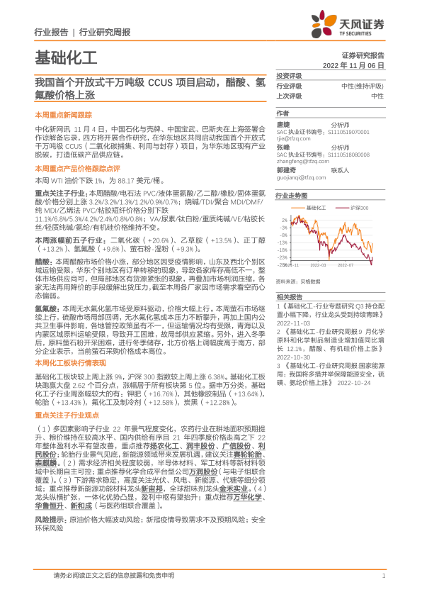 基础化工行业研究周报:我国首个开放式千万吨级CCUS项目启动,醋酸、氢氟酸价格上涨