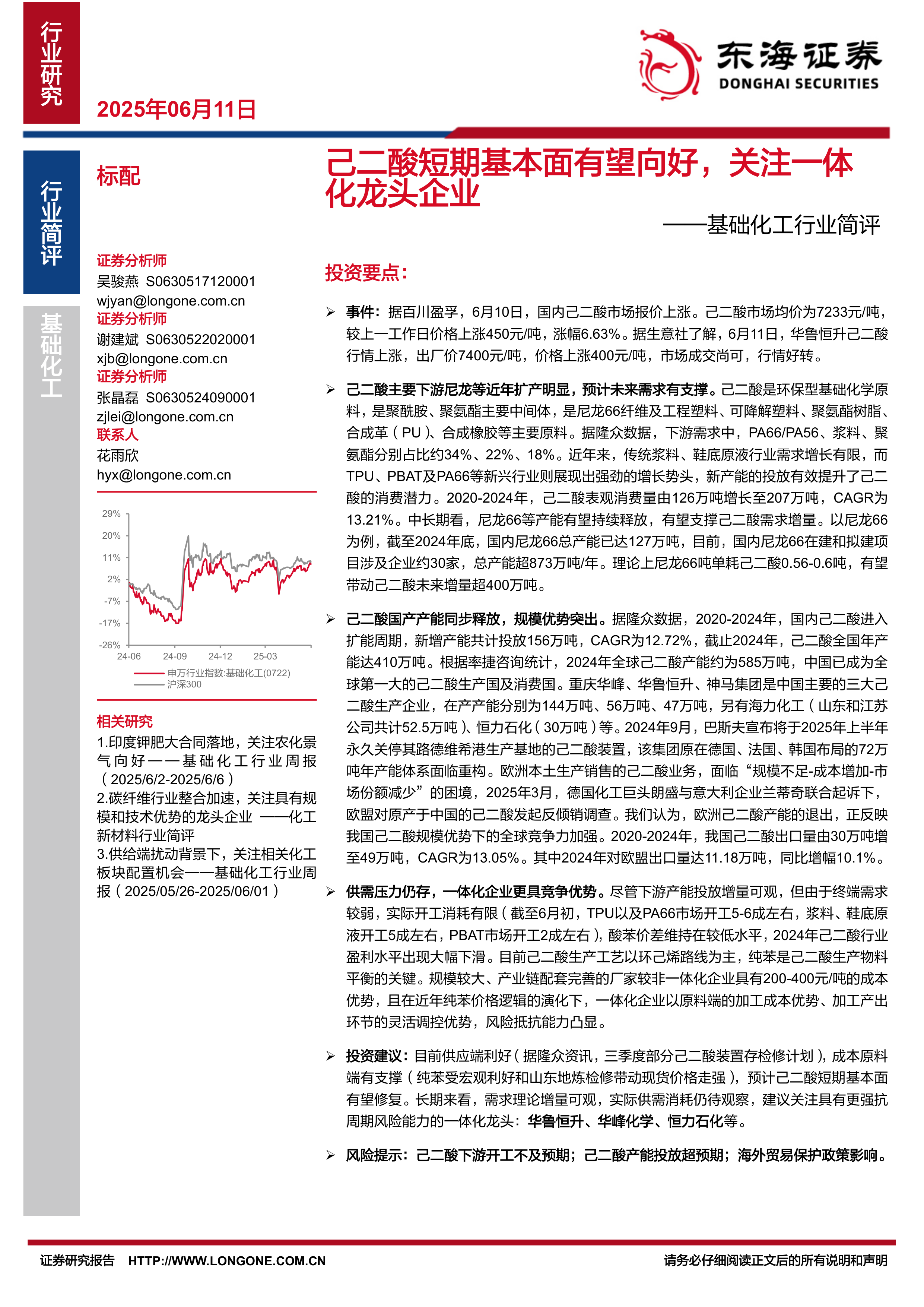 基础化工行业简评:己二酸短期基本面有望向好,关注一体化龙头企业