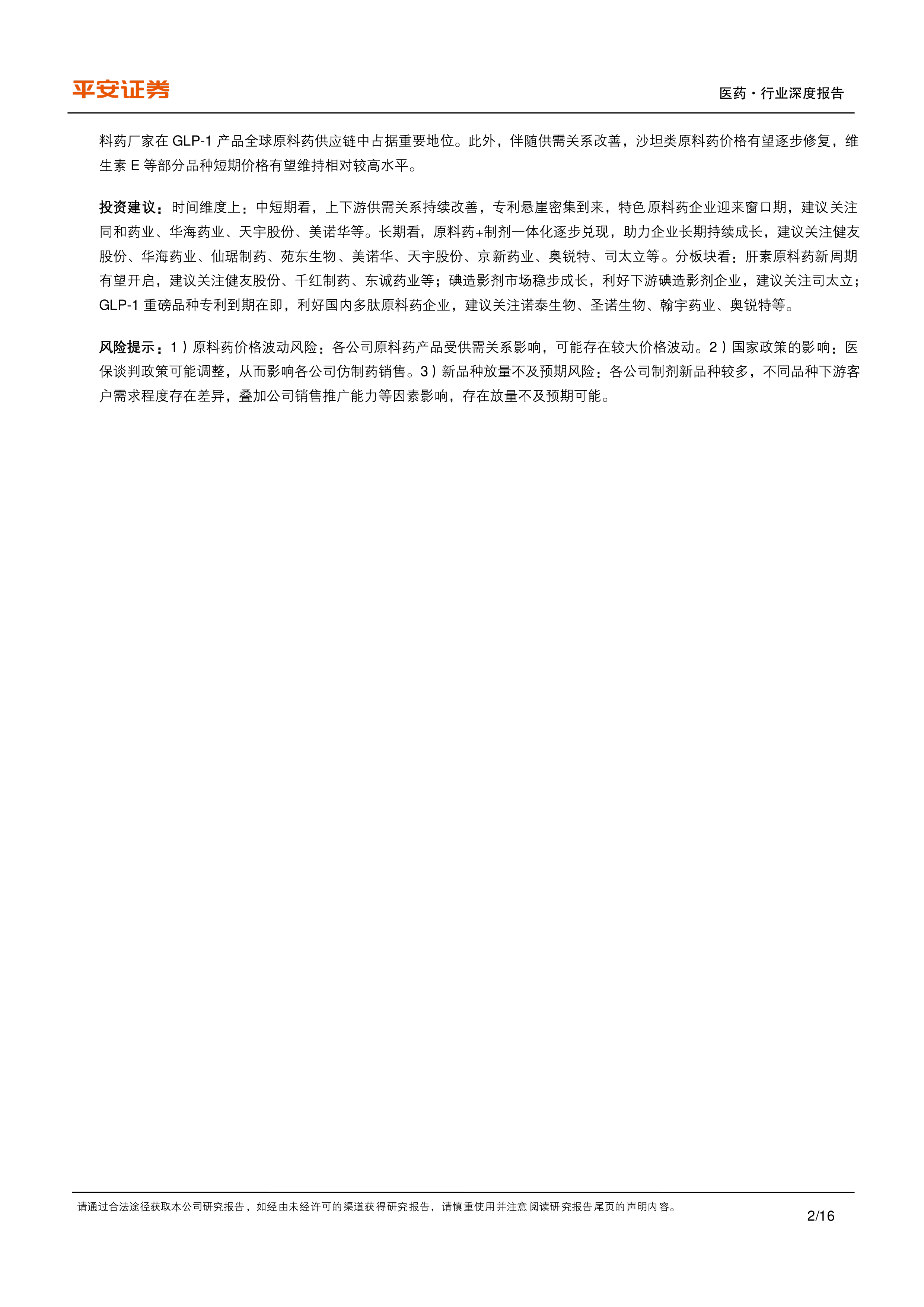 投资建议:时间维度上:中短期看,上下游供需关系持续改善,专利悬崖密集到来,特色原料药企业迎来窗口期,建议关注同和药业、华海药业、天宇股份、美诺华等。长期看,原料药+制剂一体化逐步兑现,助力企业长期持续成长,建议关注健友股份、华海药业、仙琚制药、苑东生物、美诺华、天宇股份、京新药业、奥锐特、司太立等。分板块看:肝素原料药新周期有望开启,建议关注健友股份、千红制药、东诚药业等;碘造影剂市场稳步成长,利好下游碘造影剂企业,建议关注司太立;GLP-1重磅品种专利到期在即,利好国内多肽原料药企业,建议关注诺泰生物、圣诺生物、翰宇药业、奥锐特等。