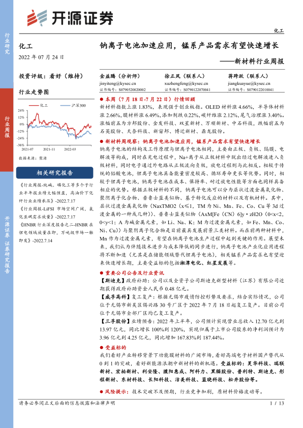 新材料行业周报:钠离子电池加速应用,锰系产品需求有望快速增长