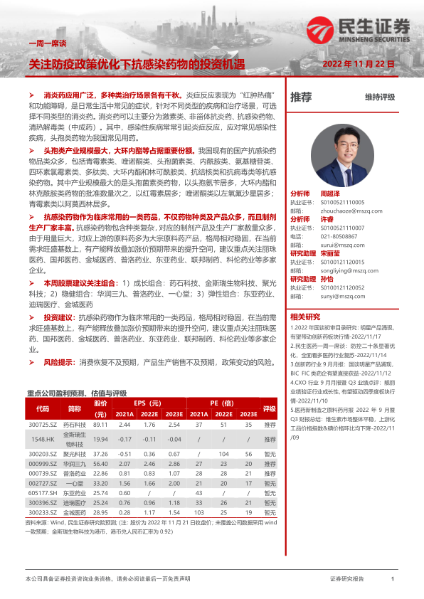 医药行业一周一席谈:关注防疫政策优化下抗感染药物的投资机遇