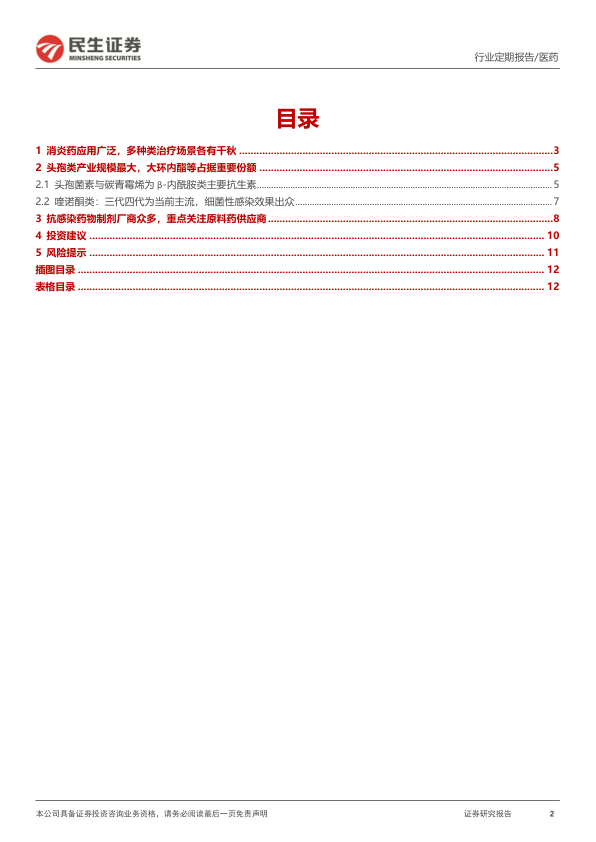 抗感染药物作为临床常用的一类药品,不仅药物种类及产品众多,而且制剂生产厂家丰富。 抗感染药物包含种类复杂,对应的制剂产品及生产厂家数量众多,由于用量巨大,对应上游的原料药多为大宗原料药产品,格局相对稳固,在当前需求旺盛基数上,有产能释放叠加涨价预期带来的提升空间,建议重点关注丽珠医药、国邦医药、金城医药、普洛药业、东亚药业、联邦制药、科伦药业等多家企业。