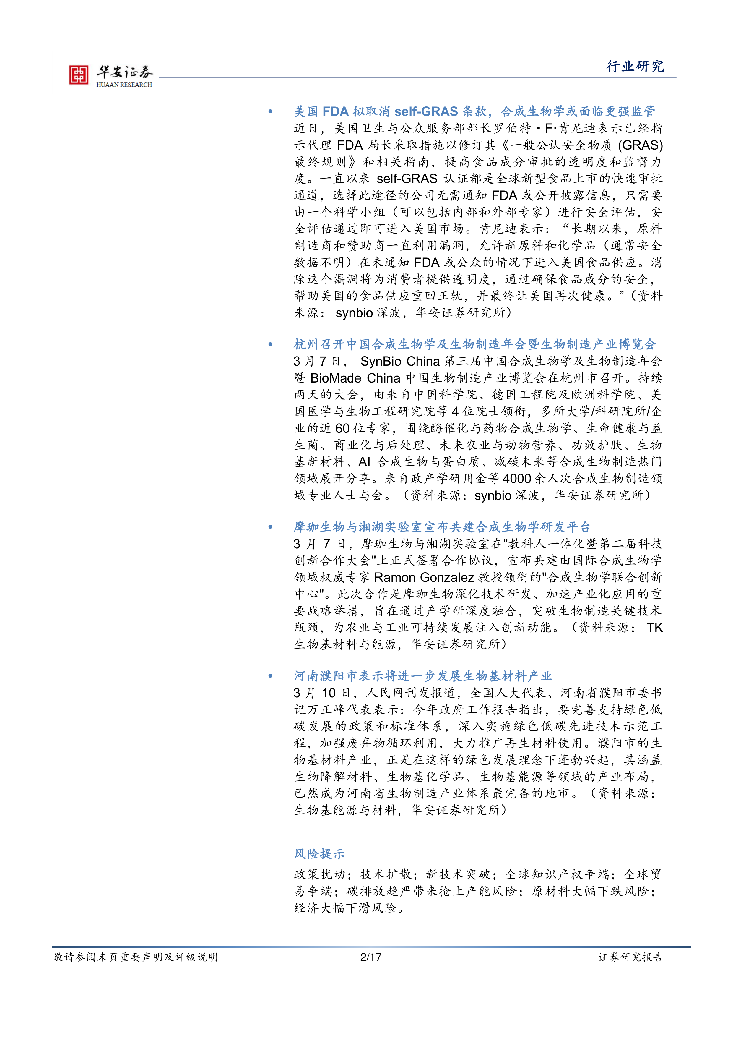 3月10日,人民网刊发报道,全国人大代表、河南省濮阳市委书记万正峰代表表示:今年政府工作报告指出,要完善支持绿色低碳发展的政策和标准体系,深入实施绿色低碳先进技术示范工程,加强废弃物循环利用,大力推广再生材料使用。濮阳市的生物基材料产业,正是在这样的绿色发展理念下蓬勃兴起,其涵盖生物降解材料、生物基化学品、生物基能源等领域的产业布局,已然成为河南省生物制造产业体系最完备的地市。(资料来源:生物基能源与材料,华安证券研究所)