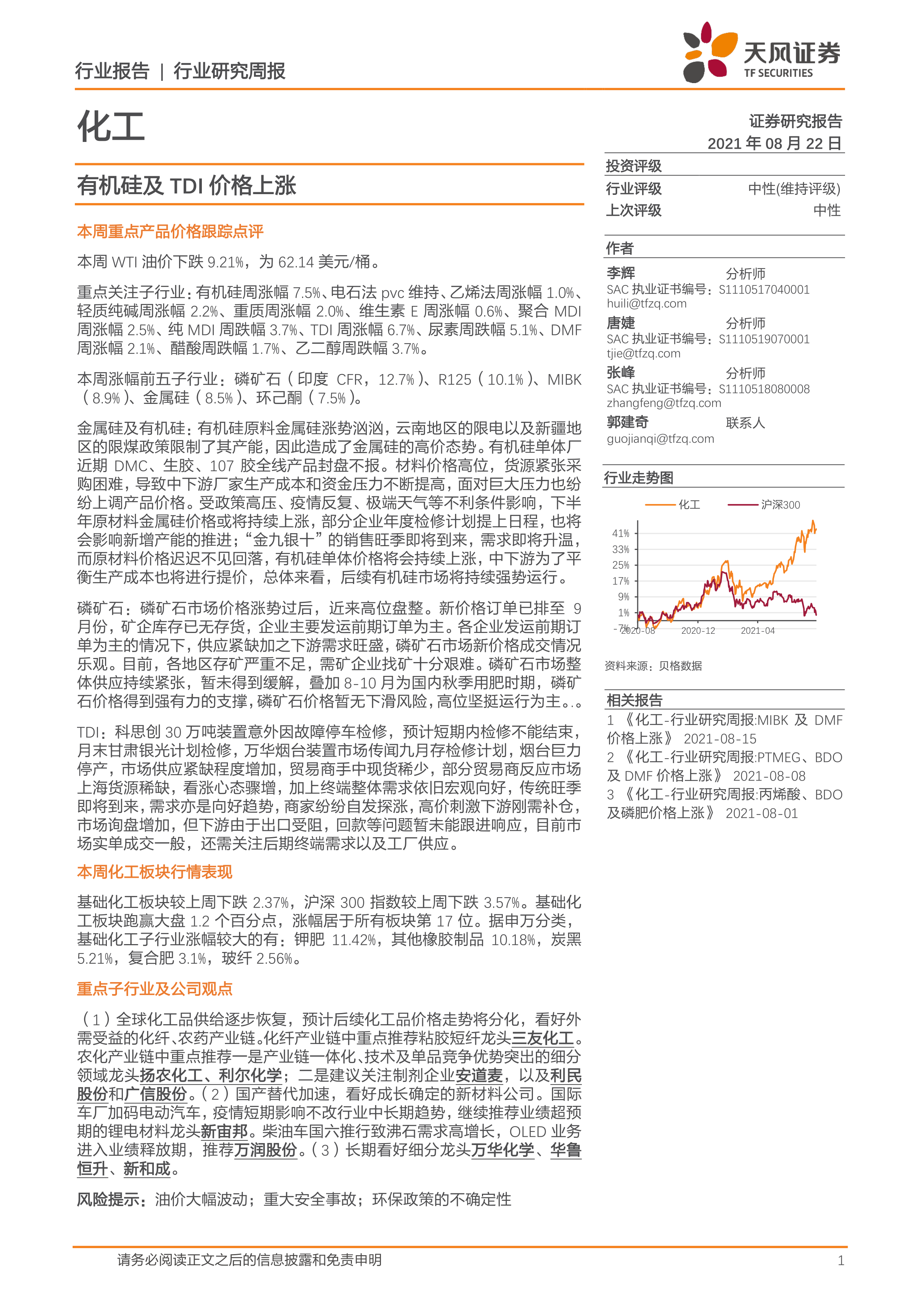 重点关注子行业: 有机硅周涨幅 7.5%、电石法 pvc 维持、乙烯法周涨幅 1.0%、轻质纯碱周涨幅 2.2%、 重质周涨幅 2.0%、维生素 E 周涨幅 0.6%、 聚合 MDI周涨幅 2.5%、 纯 MDI 周跌幅 3.7%、 TDI 周涨幅 6.7%、尿素周跌幅 5.1%、 DMF周涨幅 2.1%、醋酸周跌幅 1.7%、 乙二醇周跌幅 3.7%。