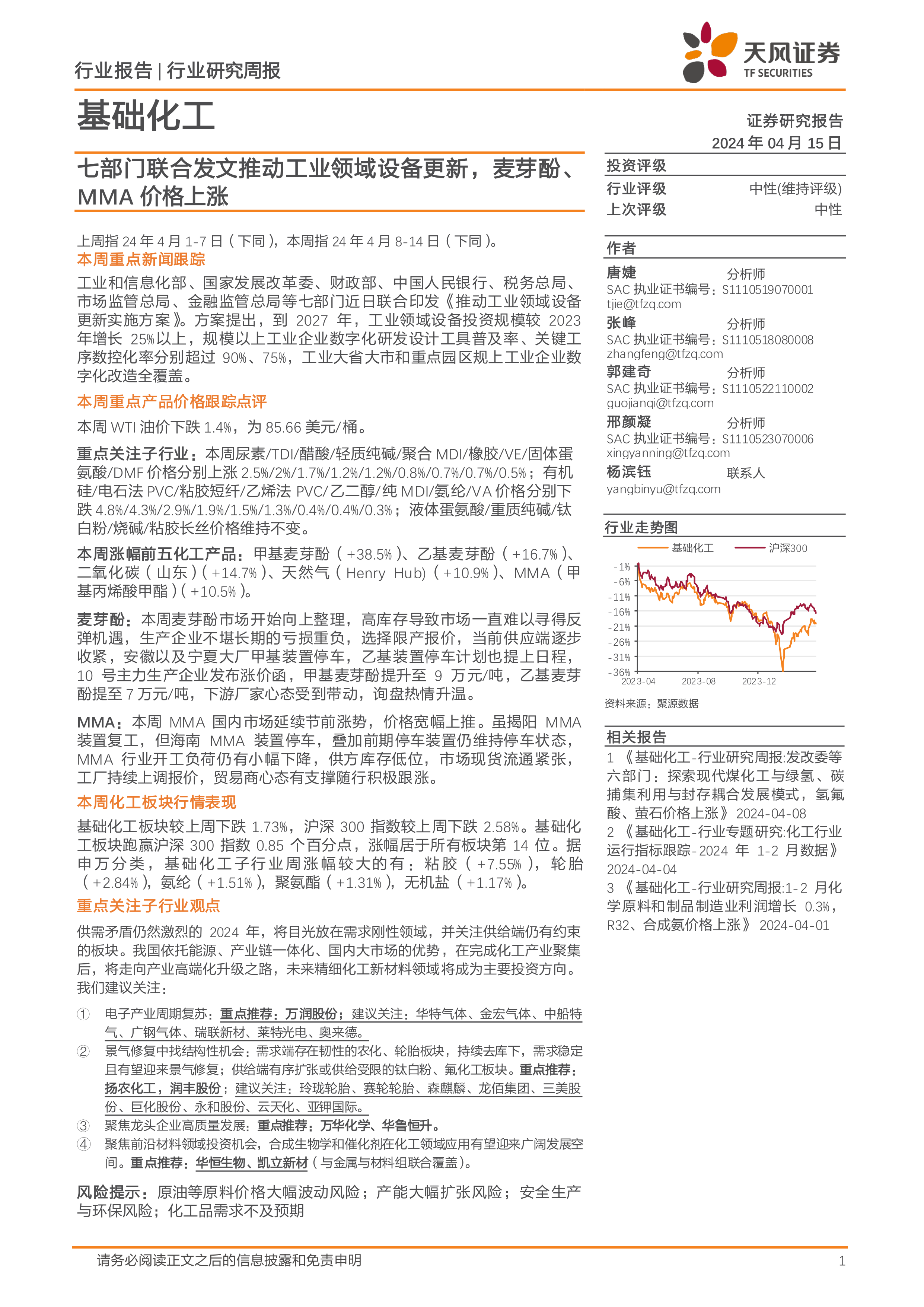 基础化工行业研究周报:七部门联合发文推动工业领域设备更新,麦芽酚、MMA价格上涨