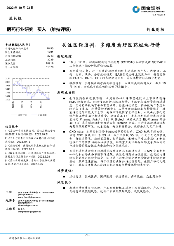 全球医药创新进展不断, 本周百济神州泽布替尼欧洲上市申请获得EMA 积极意见, 继续催化创新药板块行情, 关注重点在研管线推进进度。 国内药品板块下半年有望业绩、估值持续修复。药品板块二季度业绩见底(集采、疫情管控等因素), 三季度开始业绩有望持续恢复,政策持续边际回暖大背景下, 关注四季度国家医保谈判,以及由此催化的明年新品种商业化加速放量,建议关注( 1)兼具研发能力和成熟销售能力的 Pharma 类企业;( 2)从 Biotech 成功成长为 BioPharma 的企业;( 3)具有创新研发能力的头部 Biotech 企业。 同时关注新冠防治相关药品及疫苗研发、放量进展,关注相关药企、疫苗企业及其产业链。