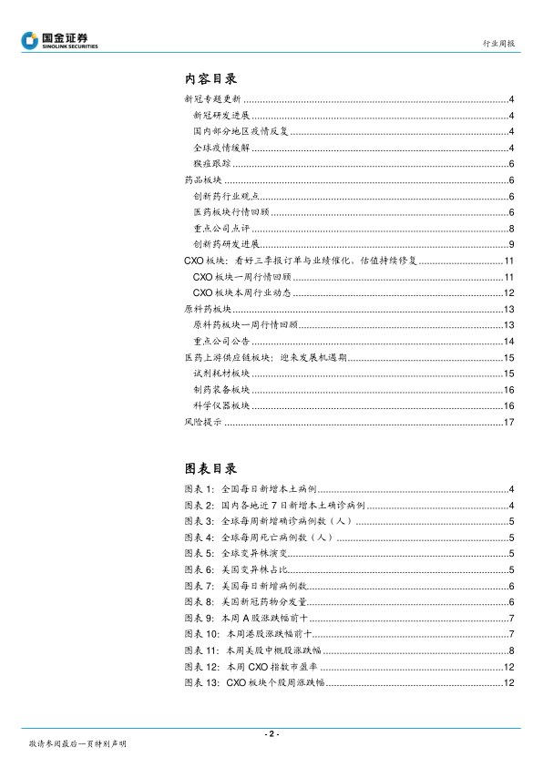 CXO 板块:本周受到海外市场波动等因素影响, CXO 板块有所回调。当前 CXO 板块 PE 为 33 倍,低于中位数 55 倍,已处于历史估值底部。 行业高景气,业绩高成长、订单饱满, 看好四季度三季报订单和业绩催化下的估值切换和估值修复。 继续重点关注具备国际竞争力和国内市场优势的综合性龙头企业和细分领域龙头。