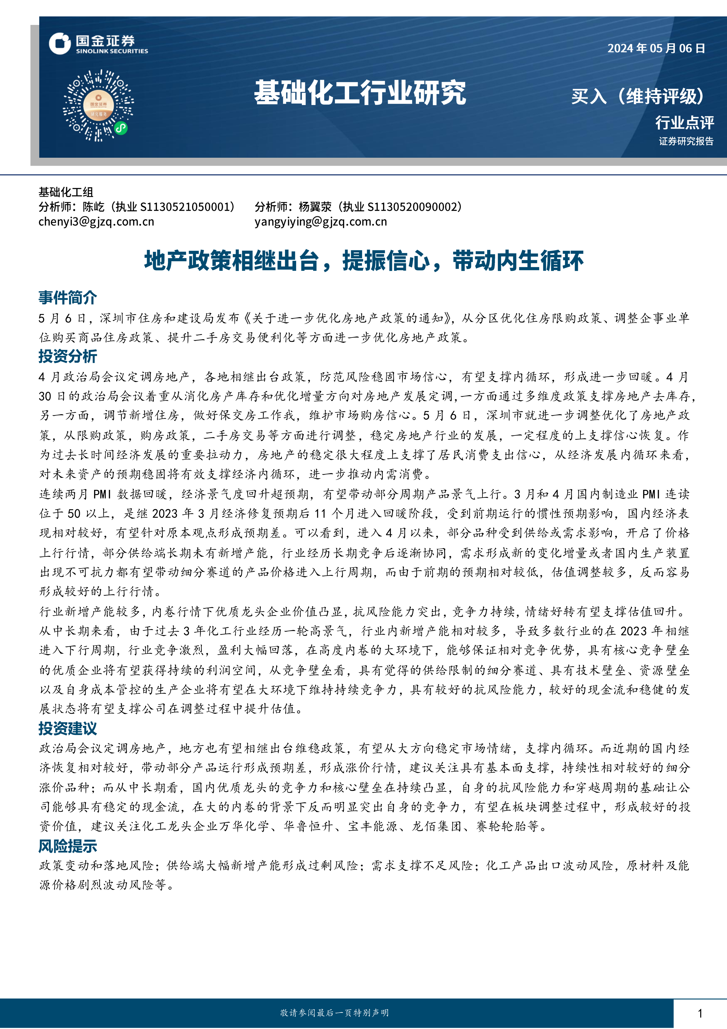 本报告分析了深圳市优化房地产政策对市场信心的影响,以及宏观经济回暖对化工行业的影响。报告指出,政策维稳有望支撑内循环,经济回暖可能带动部分周期性产品价格上涨。在行业竞争激烈的背景下,具备核心竞争力的龙头企业价值凸显。建议关注受益于政策和涨价的细分领域,以及具有较好抗风险能力的化工龙头企业。同时,报告也提示了政策变动、供给过剩、需求不足等风险。