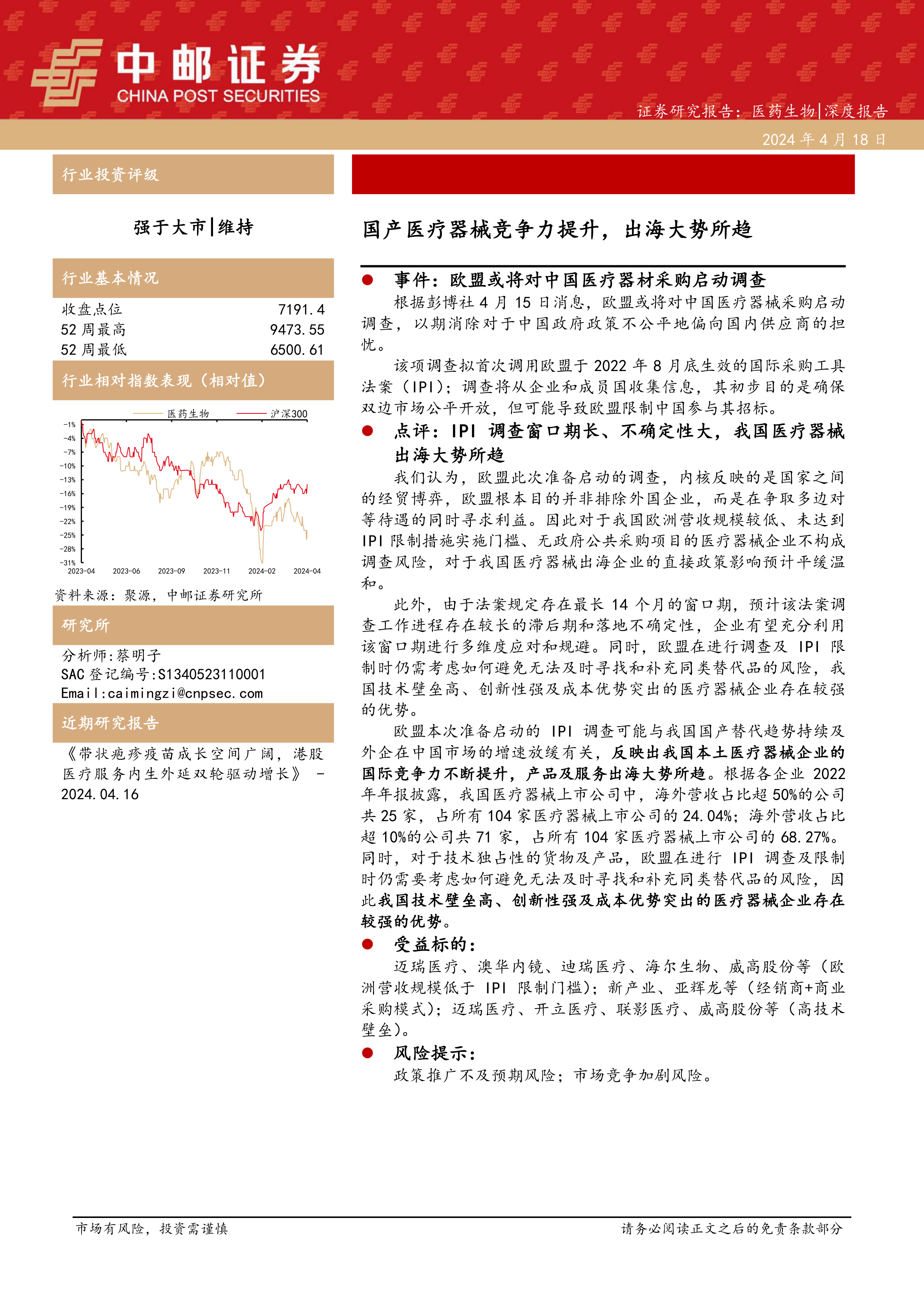 本报告分析了欧盟可能对中国医疗器械采购启动调查的影响。报告指出,IPI调查的影响有限,但国产医疗器械出海是大势所趋。报告还列出了受益标的,并提示了相关风险。总体而言,报告认为,中国医疗器械企业应积极应对IPI调查,抓住出海机遇,提升自身竞争力。