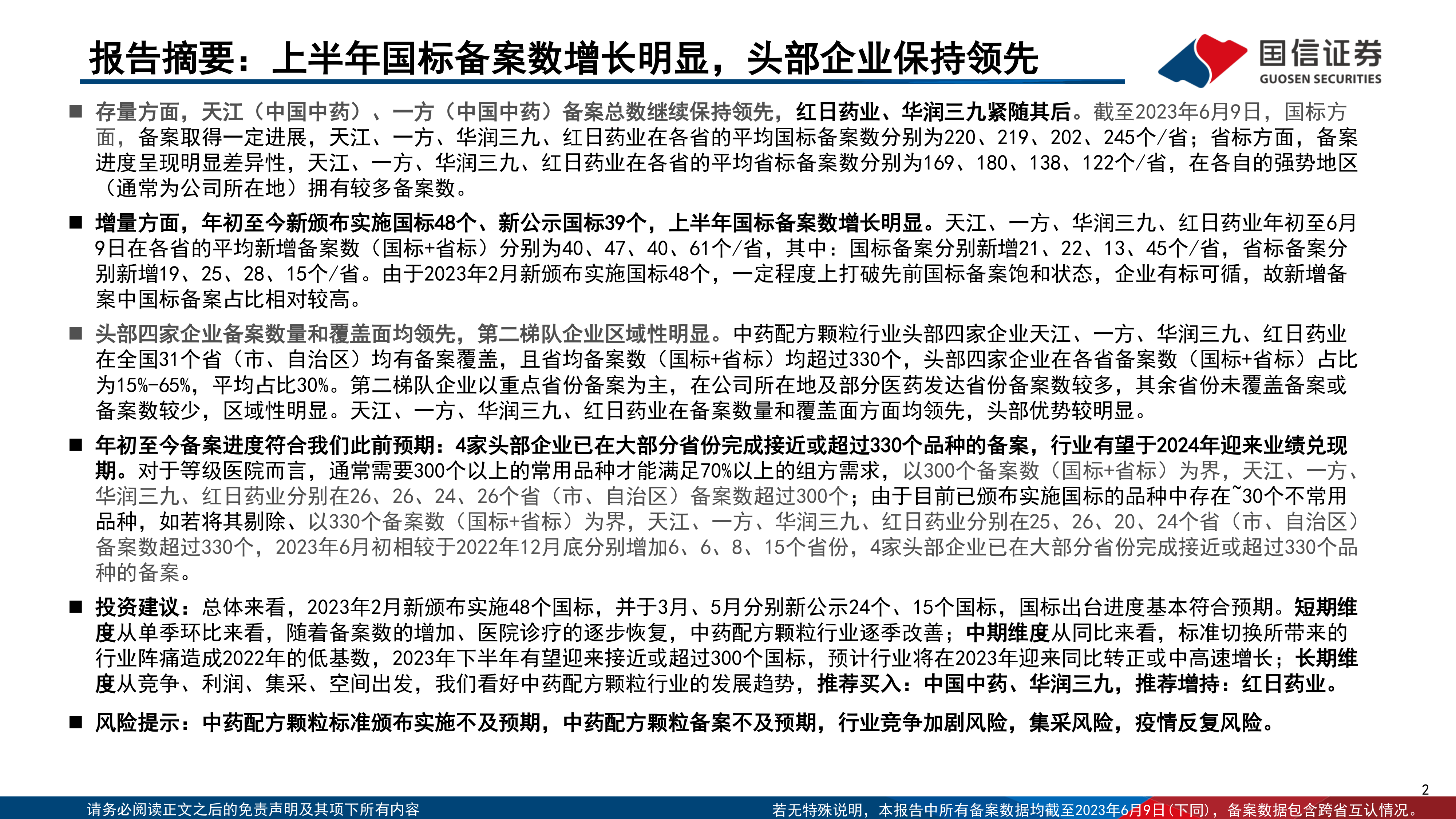 投资建议:总体来看,2023年2月新颁布实施48个国标,并于3月、5月分别新公示24个、15个国标,国标出台进度基本符合预期。短期维度从单季环比来看,随着备案数的增加、医院诊疗的逐步恢复,中药配方颗粒行业逐季改善;中期维度从同比来看,标准切换所带来的行业阵痛造成2022年的低基数,2023年下半年有望迎来接近或超过300个国标,预计行业将在2023年迎来同比转正或中高速增长;长期维度从竞争、利润、集采、空间出发,我们看好中药配方颗粒行业的发展趋势,推荐买入:中国中药、华润三九,推荐增持:红日药业。