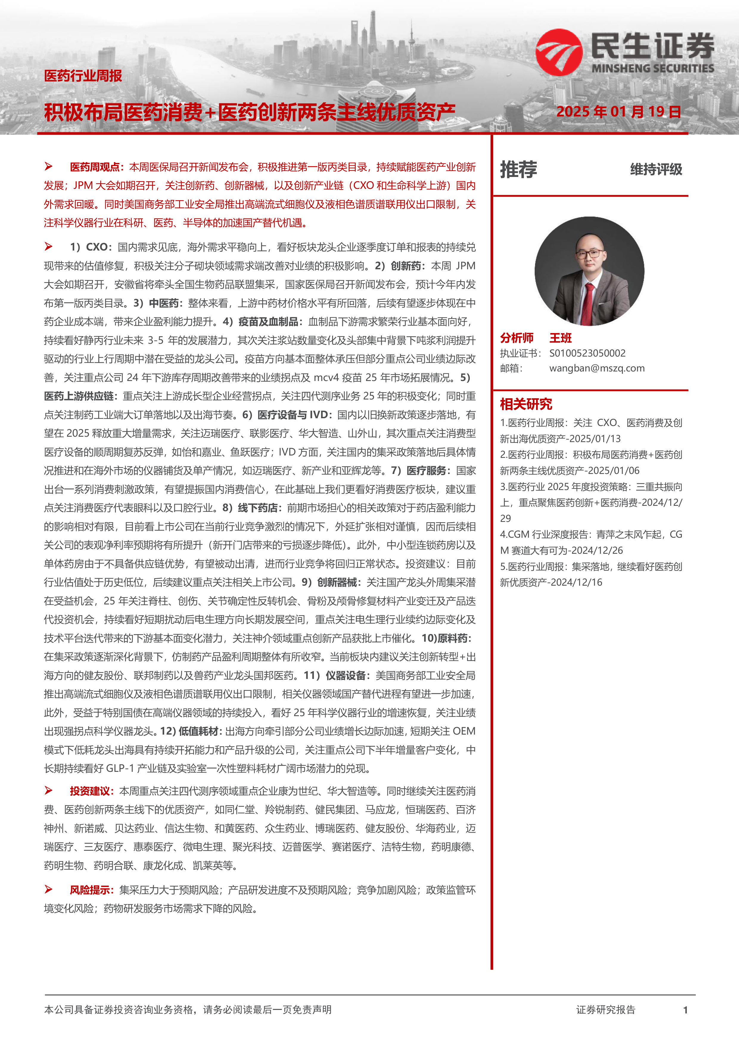 1)CXO:国内需求见底,海外需求平稳向上,看好板块龙头企业逐季度订单和报表的持续兑现带来的估值修复,积极关注分子砌块领域需求端改善对业绩的积极影响。2)创新药:本周JPM大会如期召开,安徽省将牵头全国生物药品联盟集采,国家医保局召开新闻发布会,预计今年内发布第一版丙类目录。3)中医药:整体来看,上游中药材价格水平有所回落,后续有望逐步体现在中药企业成本端,带来企业盈利能力提升。4)疫苗及血制品:血制品下游需求繁荣行业基本面向好,持续看好静丙行业未来3-5年的发展潜力,其次关注浆站数量变化及头部集中背景下吨浆利润提升驱动的行业上行周期中潜在受益的龙头公司。疫苗方向基本面整体承压但部分重点公司业绩边际改善,关注重点公司24年下游库存周期改善带来的业绩拐点及mcv4疫苗25年市场拓展情况。5)医药上游供应链:重点关注上游成长型企业经营拐点,关注四代测序业务25年的积极变化;同时重点关注制药工业端大订单落地以及出海节奏。6)医疗设备与IVD:国内以旧换新政策逐步落地,有望在2025释放重大增量需求,关注迈瑞医疗、联影医疗、华大智造、山外山,其次重点关注消费型医疗设备的顺周期复苏反弹,如怡和嘉业、鱼跃医疗;IVD方面,关注国内的集采政策落地后具体情况推进和在海外市场的仪器铺货及单产情况,如迈瑞医疗、新产业和亚辉龙等。7)医疗服务:国家出台一系列消费刺激政策,有望提振国内消费信心,在此基础上我们更看好消费医疗板块,建议重点关注消费医疗代表眼科以及口腔行业。8)线下药店:前期市场担心的相关政策对于药店盈利能力的影响相对有限,目前看上市公司在当前行业竞争激烈的情况下,外延扩张相对谨慎,因而后续相关公司的表观净利率预期将有所提升(新开门店带来的亏损逐步降低)。此外,中小型连锁药房以及单体药房由于不具备供应链优势,有望被动出清,进而行业竞争将回归正常状态。投资建议:目前行业估值处于历史低位,后续建议重点关注相关上市公司。9)创新器械:关注国产龙头外周集采潜在受益机会,25年关注脊柱、创伤、关节确定性反转机会、骨粉及颅骨修复材料产业变迁及产品迭代投资机会,持续看好短期扰动后电生理方向长期发展空间,重点关注电生理行业续约边际变化及技术平台迭代带来的下游基本面变化潜力,关注神介领域重点创新产品获批上市催化。10)原料药: