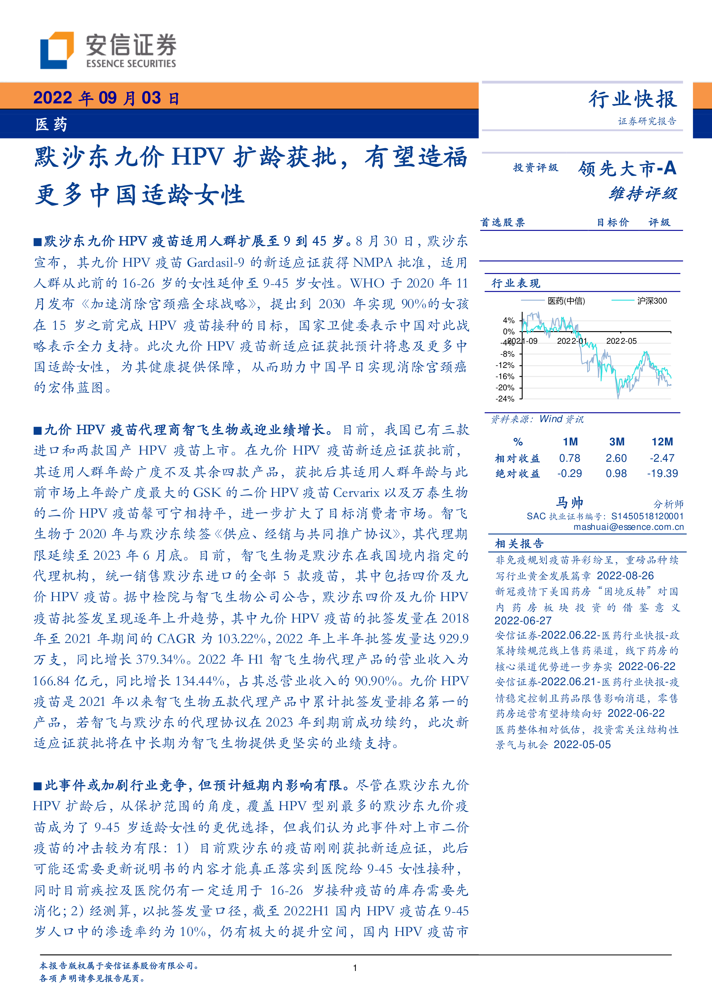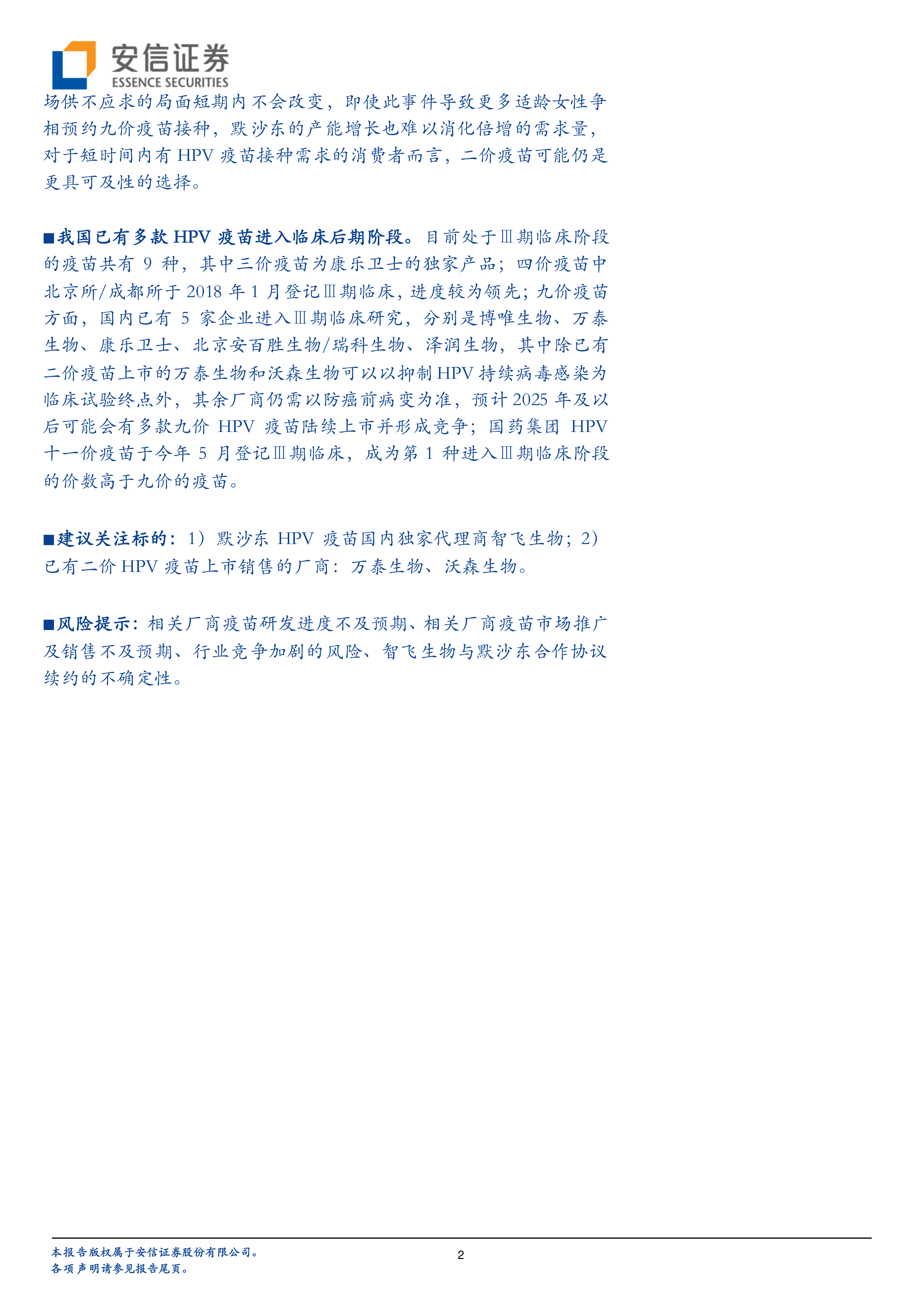风险提示:相关厂商疫苗研发进度不及预期、相关厂商疫苗市场推广及销售不及预期、行业竞争加剧的风险、智飞生物与默沙东合作协议续约的不确定性。