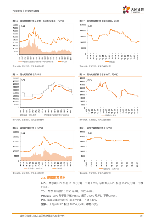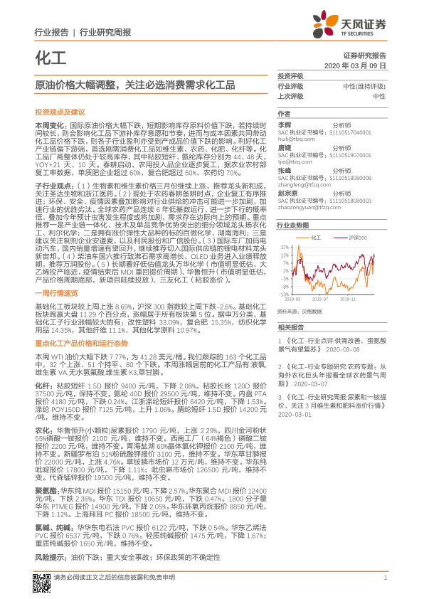 本报告深入分析了2020年3月9日当周化工行业的市场动态与投资策略。国际原油价格的剧烈波动对化工品原料价值及下游补库存意愿构成显著影响,促使行业将投资重心转向具有刚性需求的必选消费化工品。尽管面临油价下行压力,基础化工板块整体表现强劲,跑赢大盘,其中改性塑料、复合肥等子行业涨幅突出。在产品价格层面,液氯、维生素VA等产品价格上涨,而丙烯腈、PBT等则出现下跌。报告强调,在当前市场环境下,应聚焦维生素、农药、锂电材料及特种化学品等细分领域的投资机会,并长期看好万华化学、华鲁恒升等低估值龙头企业。同时,投资者需警惕油价持续下跌、重大安全事故及环保政策不确定性可能带来的风险。