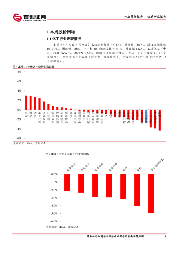 本周化工板块表现:本周(6月5日-6月9日)上证综指报收3231.41,周涨幅0.04%,深证成指报收10793.93,周跌幅1.86%,中小板100指数报收7071.72,周跌幅1.62%,基础化工(申万)报收3636.35,周跌幅2.67%,跑输上证综指2.71pct。申万31个一级行业,11个涨幅为正,申万化工7个二级子行业中,涨幅均为负,申万化工23个三级子行业中,3个涨幅为正。本周化工行业386家上市公司中,有53家涨幅为正。涨幅居前的个股有*ST榕泰、东方材料、宏达股份、金牛化工、三维股份、百龙创园等。