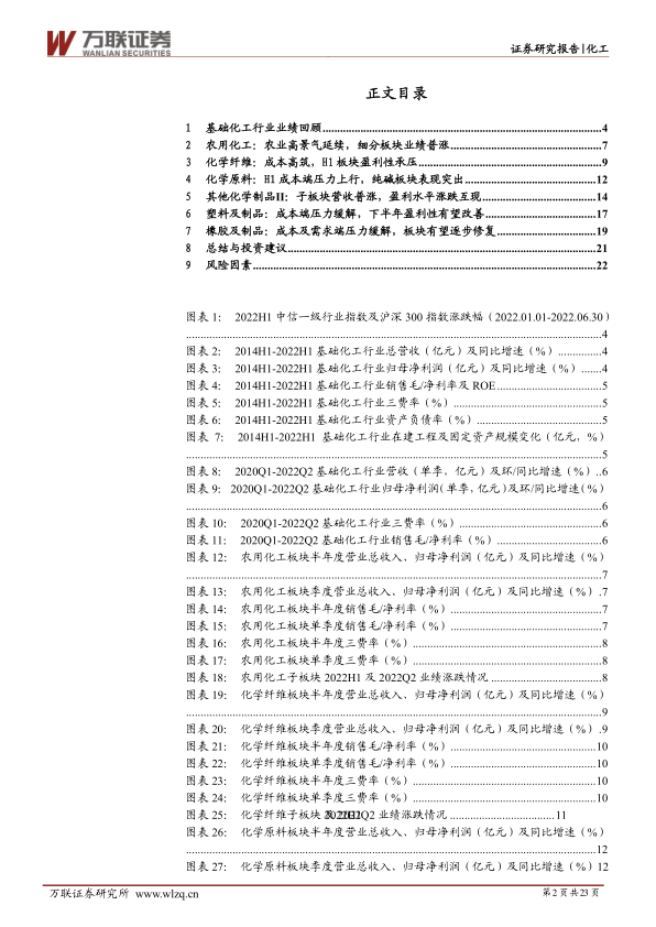 景气延续,2022H1化工行业业绩维持高增长。2022年上半年,在海外需求修复、主要产油国扩产不及预期、乌俄冲突加剧全球能源断供担忧的背景下,国际油气价格冲高并维持高位震荡运行。在成本端压力下,化工品价格普遍再度上调或维持高位震荡,进而使得报告期内中信基础化工行业业绩维持较为可观的增速,板块2022H1实现营业总收入12843.13亿元,同比增长29.25%;实现归母净利润1586.11亿元,同比增长36.71%;净资产收益率、销售净利率分别为6.91%和13.10%,同比分别增长了0.21、0.60pct。其中,Q2基础化工行业实现营业总收入6832.83亿元,同比增长27.17%,环比增长13.90%;实现归母净利润857.84亿元,同比增长27.96%,环比增长17.98%;销售毛利率和销售净利率分别为23.37%和13.40%,分别同比回落1.74pcts、0.18pct,环比回落0.57pcts、增长0.63pcts。期间中信基础化工行业指数跌幅为4.47%,沪深300指数跌幅为9.22%,基础化工行业指数跑赢沪深300指数4.75pcts。