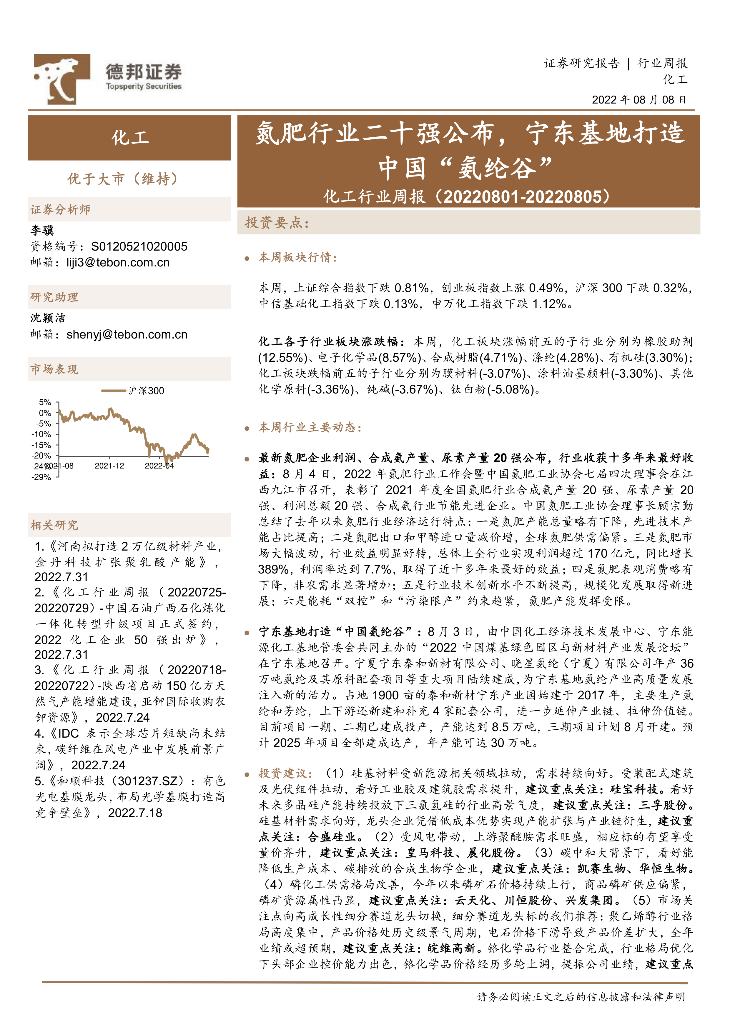 化工行业周报:氮肥行业二十强公布,宁东基地打造中国“氨纶谷”