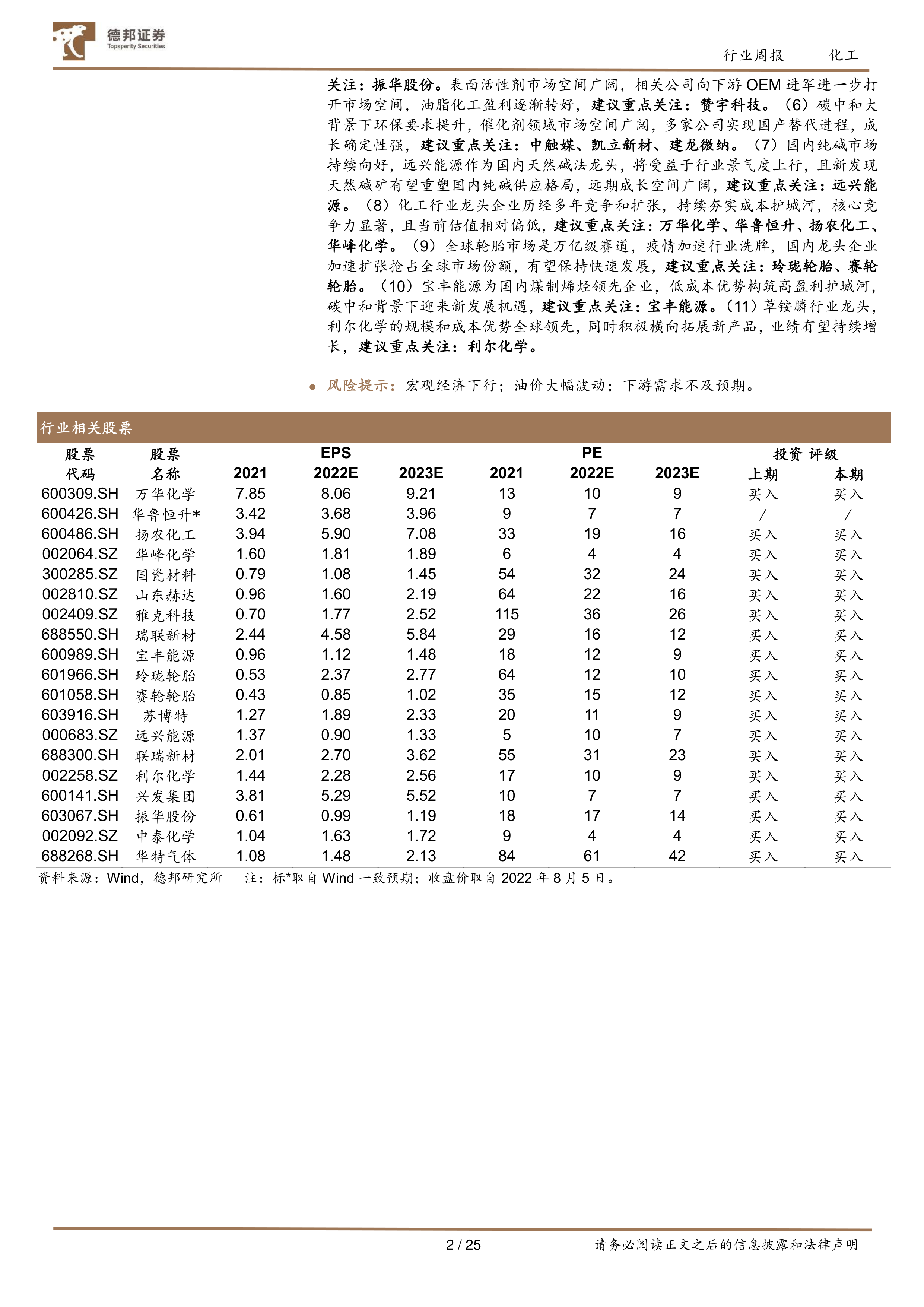 投资建议:(1)硅基材料受新能源相关领域拉动,需求持续向好。受装配式建筑及光伏组件拉动,看好工业胶及建筑胶需求提升, 建议重点关注:硅宝科技。看好未来多晶硅产能持续投放下三氯氢硅的行业高景气度,建议重点关注:三孚股份。硅基材料需求向好,龙头企业凭借低成本优势实现产能扩张与产业链衍生, 建议重点关注:合盛硅业。(2)受风电带动,上游聚醚胺需求旺盛,相应标的有望享受量价齐升,建议重点关注:皇马科技、晨化股份。(3)碳中和大背景下,看好能降低生产成本、碳排放的合成生物学企业,建议重点关注:凯赛生物、华恒生物。(4)磷化工供需格局改善,今年以来磷矿石价格持续上行,商品磷矿供应偏紧,磷矿资源属性凸显,建议重点关注:云天化、川恒股份、兴发集团。(5)市场关注点向高成长性细分赛道龙头切换,细分赛道龙头标的我们推荐:聚乙烯醇行业格局高度集中,产品价格处历史级景气周期,电石价格下滑导致产品价差扩大,全年业绩或超预期, 建议重点关注:皖维高新。铬化学品行业整合完成,行业格局优化下头部企业控价能力出色,铬化学品价格经历多轮上调,提振公司业绩, 建议重点关注:振华股份。表面活性剂市场空间广阔,相关公司向下游 OEM 进军进一步打开市场空间,油脂化工盈利逐渐转好,建议重点关注:赞宇科技。(6)碳中和大背景下环保要求提升,催化剂领域市场空间广阔,多家公司实现国产替代进程,成长确定性强,建议重点关注:中触媒、凯立新材、建龙微纳。(7)国内纯碱市场持续向好,远兴能源作为国内天然碱法龙头,将受益于行业景气度上行,且新发现天然碱矿有望重塑国内纯碱供应格局,远期成长空间广阔, 建议重点关注:远兴能源。(8)化工行业龙头企业历经多年竞争和扩张,持续夯实成本护城河,核心竞争力显著,且当前估值相对偏低, 建议重点关注:万华化学、华鲁恒升、扬农化工、华峰化学。(9)全球轮胎市场是万亿级赛道,疫情加速行业洗牌,国内龙头企业加速扩张抢占全球市场份额,有望保持快速发展, 建议重点关注:玲珑轮胎、赛轮轮胎。(10)宝丰能源为国内煤制烯烃领先企业,低成本优势构筑高盈利护城河,碳中和背景下迎来新发展机遇, 建议重点关注:宝丰能源。 (11) 草铵膦行业龙头,利尔化学的规模和成本优势全球领先,同时积极横向拓展新产品,业绩有望持续增长,建议重点关注:利尔化学。