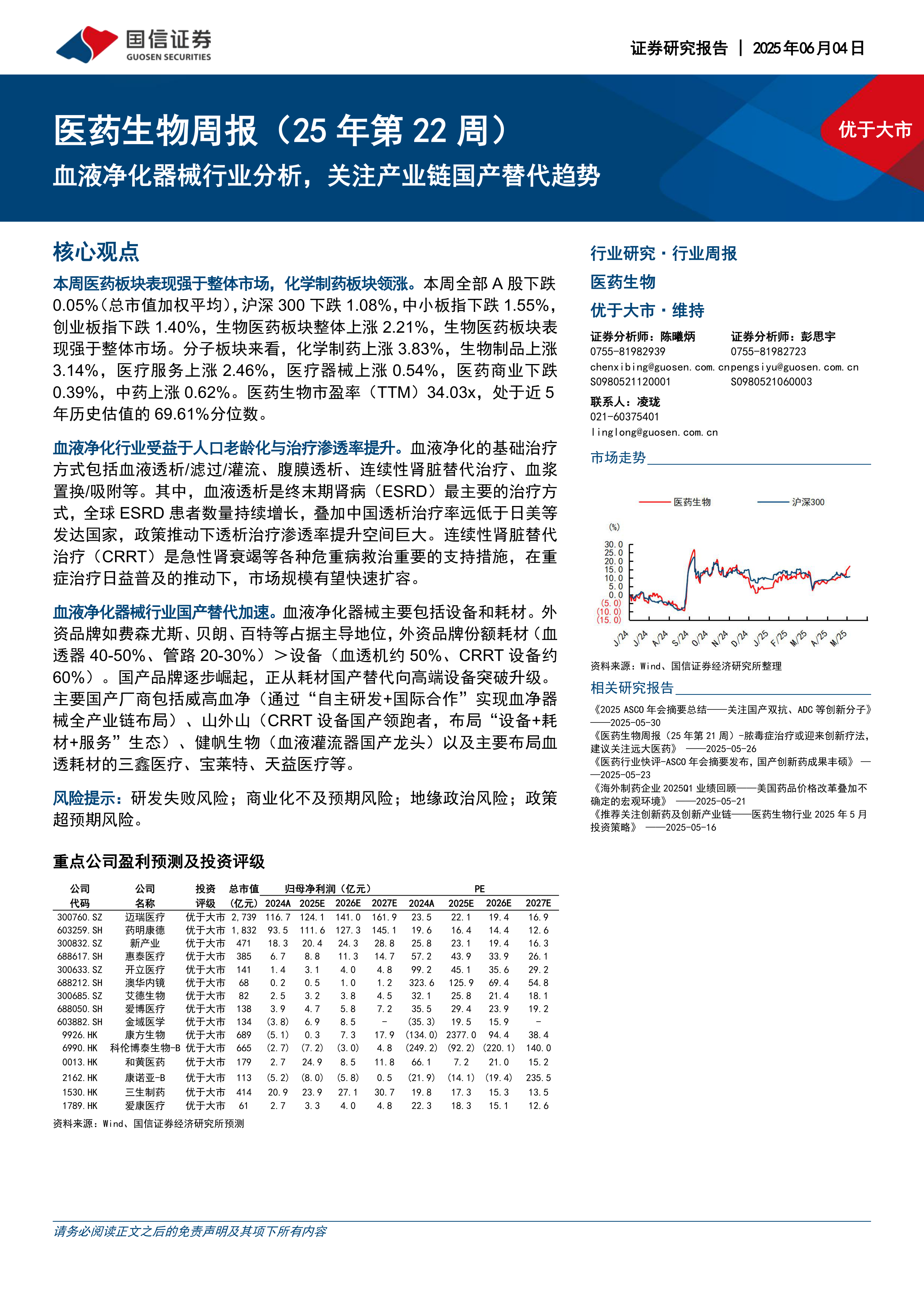 本周医药生物板块整体表现突出,尤其在血液净化器械领域,受益于全球人口老龄化、ESRD患者数量增长以及中国透析治疗渗透率的巨大提升空间,行业展现出强劲的增长潜力。尽管外资品牌仍占据主导地位,但以威高血净、山外山、健帆生物为代表的国产品牌正加速崛起,在耗材领域已取得领先地位,并逐步向高端设备市场突破,国产替代趋势显著。市场行情回顾显示医药生物板块跑赢大盘,估值处于合理区间。报告同时列举了多家具备投资价值的重点公司,并提示了研发失败、商业化不及预期、地缘政治及政策超预期等风险。