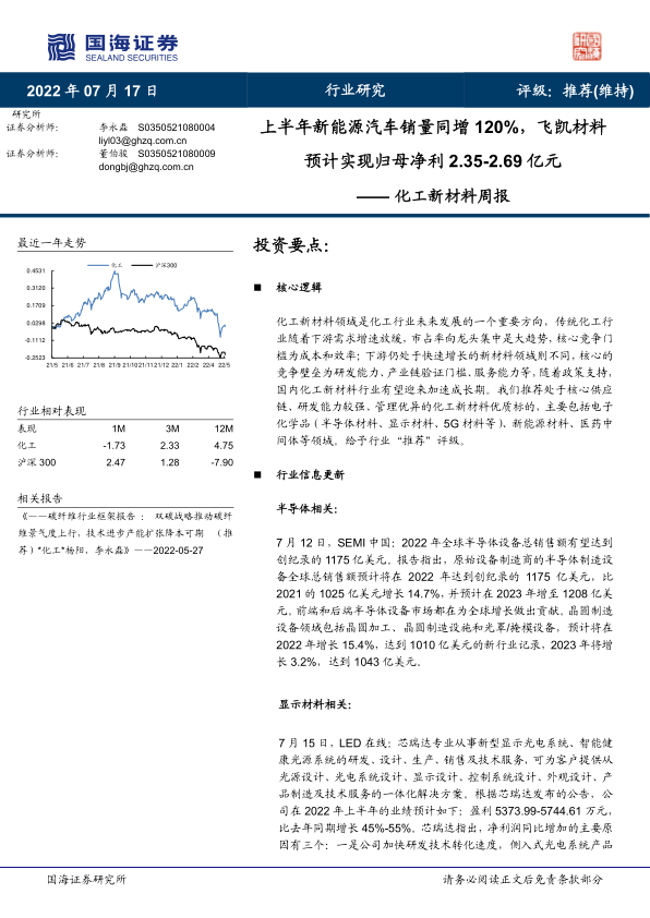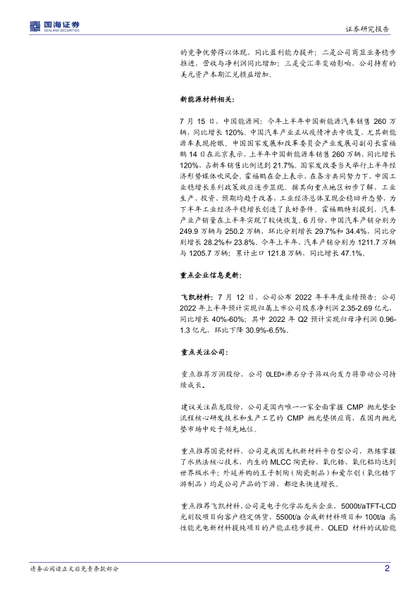 化工新材料周报:上半年新能源汽车销量同增120%,飞凯材料预计实现归母净利2.35-2.69亿元