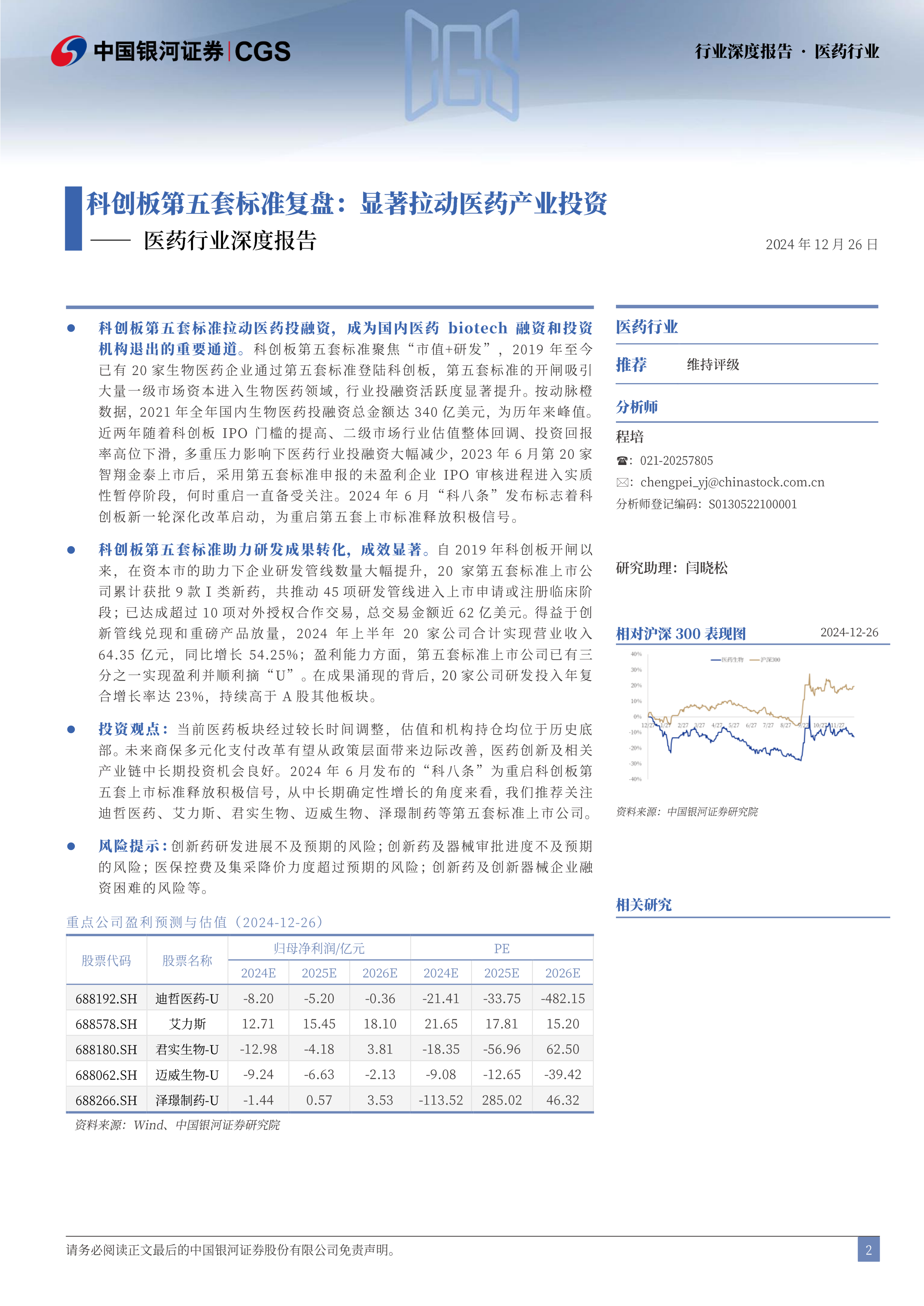 投资观点:当前医药板块经过较长时间调整,估值和机构持仓均位于历史底部。未来商保多元化支付改革有望从政策层面带来边际改善,医药创新及相关产业链中长期投资机会良好。2024年6月发布的“科八条”为重启科创板第五套上市标准释放积极信号,从中长期确定性增长的角度来看,我们推荐关注迪哲医药、艾力斯、君实生物、迈威生物、泽璟制药等第五套标准上市公司。