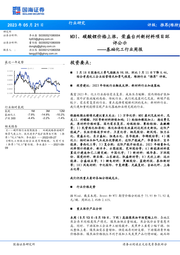 根据短期业绩情况建议重点关注:1)万华化学:MDI盈利见底回升,尼龙12、柠檬醛、POE等新材料持续加码;2)轮胎和橡胶加工:海运费见底,原材料价格回落,国内需求复苏,玲珑轮胎、赛轮轮胎、森麒麟等;3)民营炼化和涤纶:炼化和涤纶长丝盈利达到历史新低,边际产能减产,长丝价格逐步回升,卫星化学、桐昆股份、新凤鸣、恒力石化、荣盛石化、东方盛虹、恒逸石化、东华能源、华锦股份等;4)煤化工:相对油头和气头成本优势提升,边际产能减产,华鲁恒升、宝丰能源、鲁西化工等;5)复合肥:边际产能开始退出,2023年销量和毛利率预计将提升,新洋丰、云图控股、芭田股份等;6)新能源材料装置设计建造和己二腈突破:中国化学;7)新材料:瑞华泰、万润股份、国瓷材料、新亚强、山东赫达、凯盛新材等;8)光伏上游:远兴能源、合盛硅业等;9)锂电材料:黑猫股份、蓝晓科技、泰和新材等;10)风电材料:中化国际、中复神鹰、光威复材、吉林化纤、上海石化等。