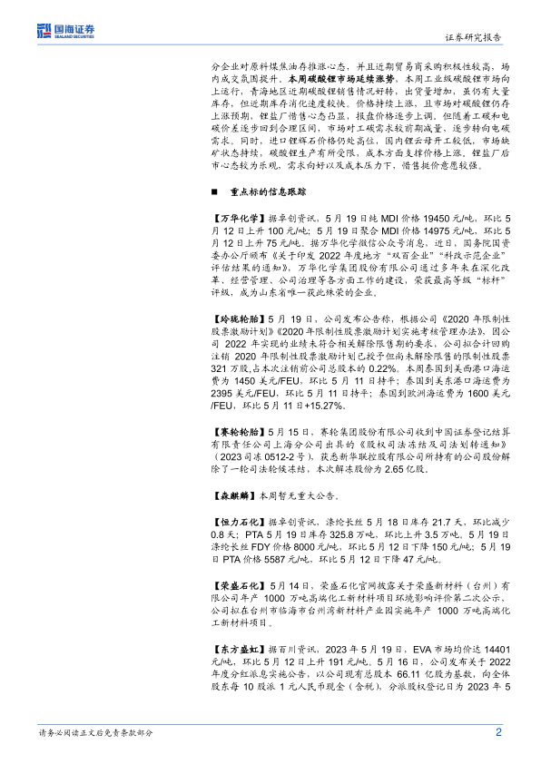 基础化工行业周报:MDI、碳酸锂价格上涨,荣盛台州新材料项目环评公示