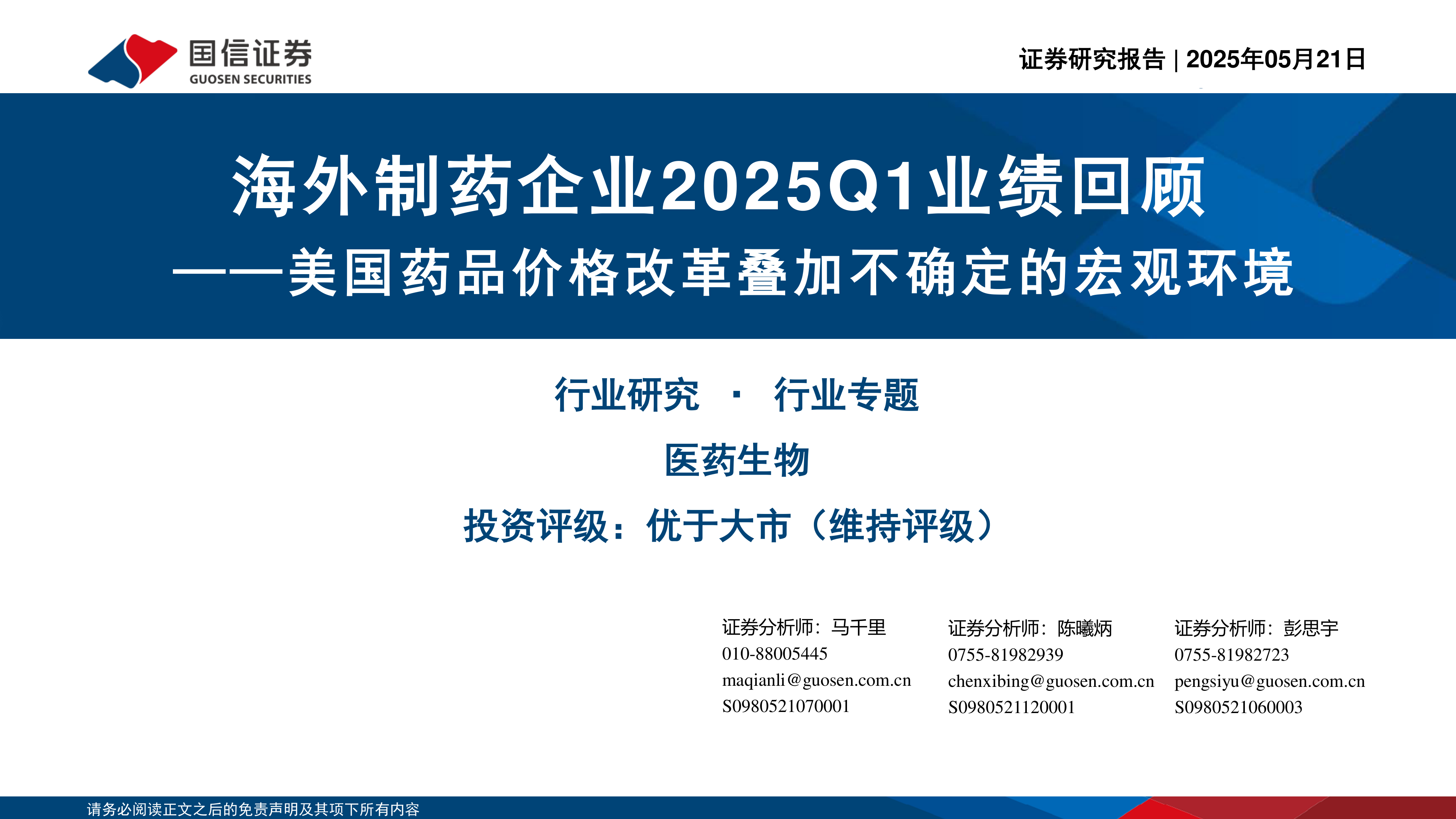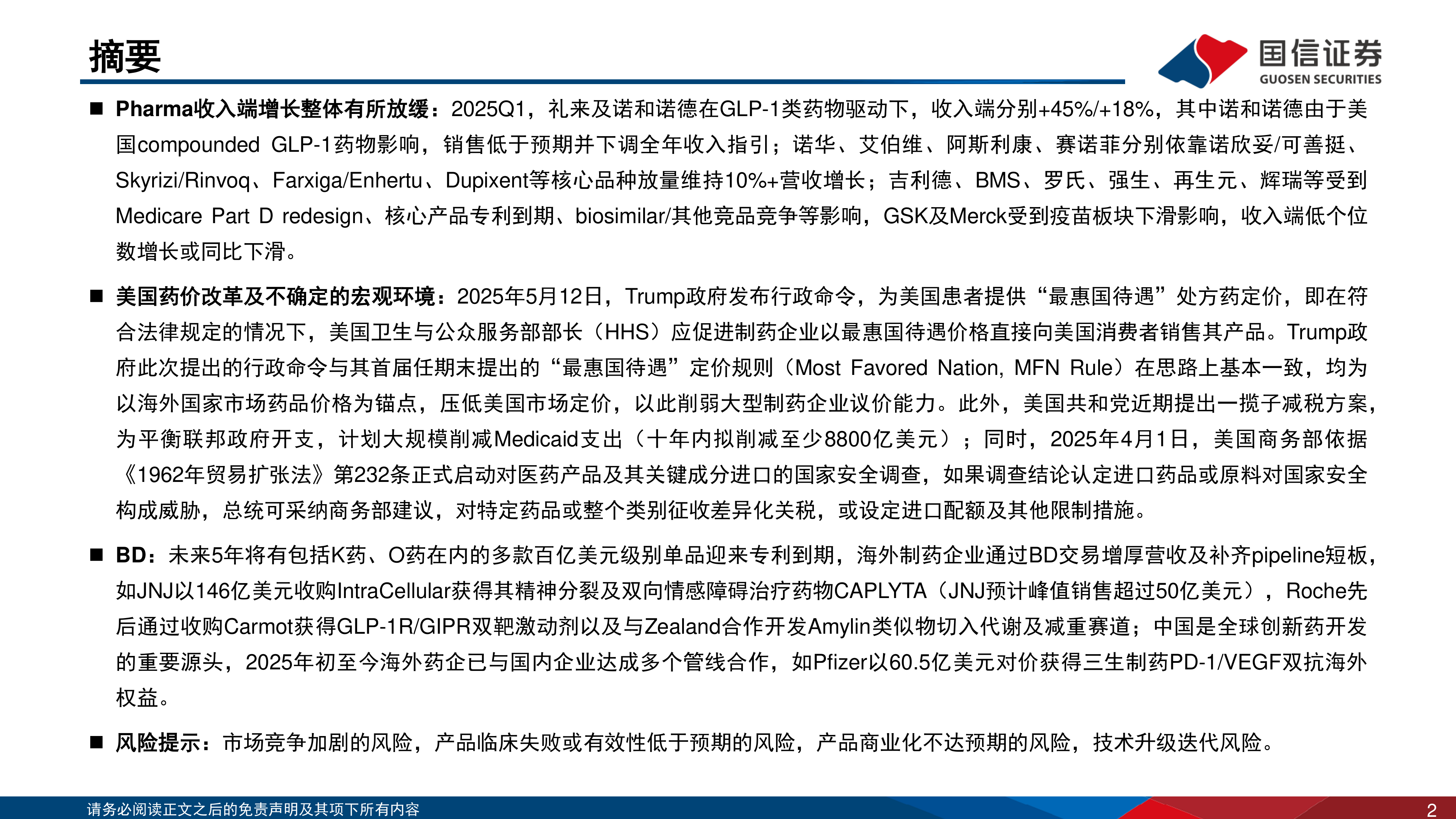 海外制药企业2025Q1业绩回顾:美国药品价格改革叠加不确定的宏观环境