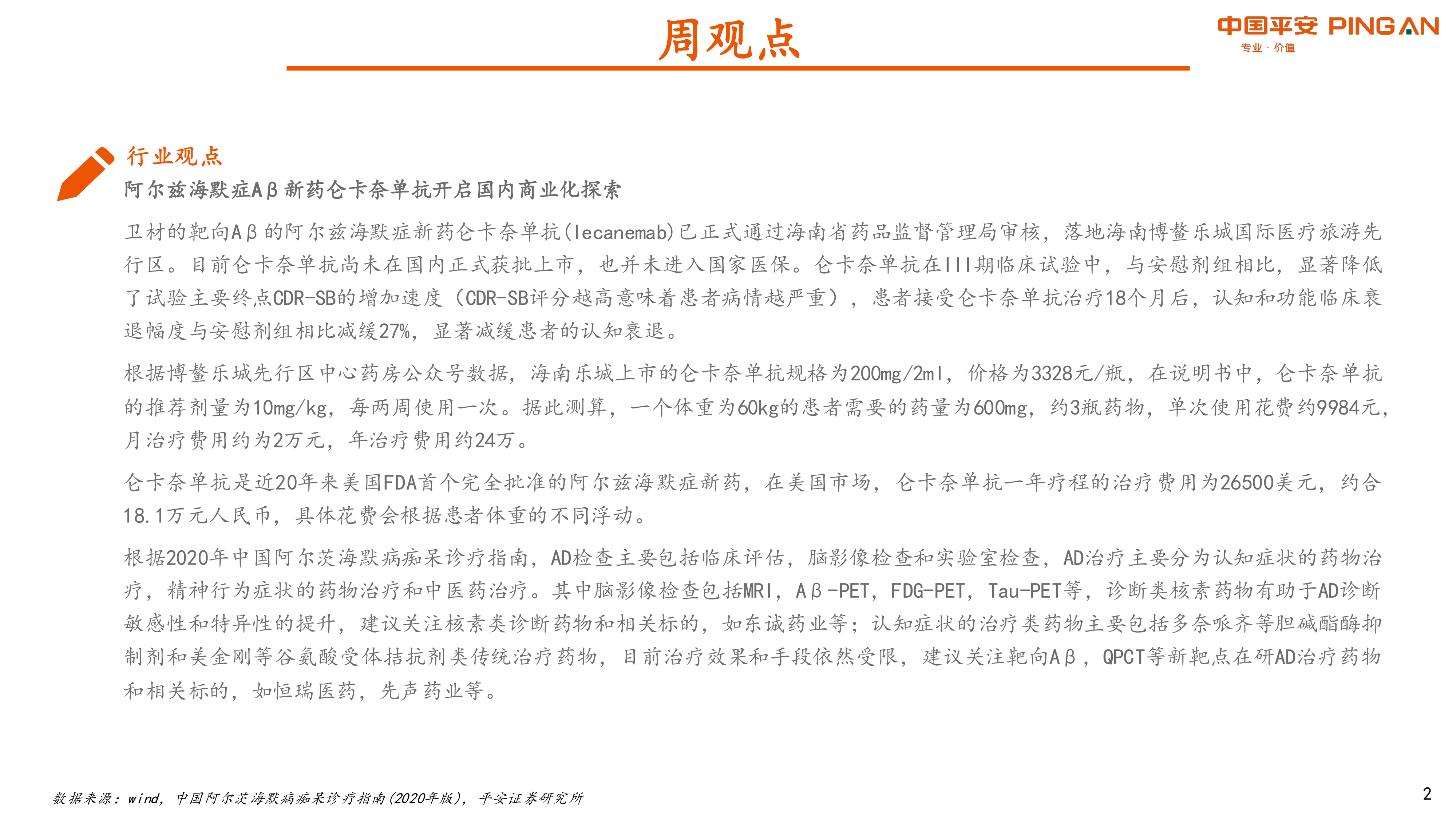 本报告核心观点聚焦于阿尔兹海默症(AD)Aβ新药仑卡奈单抗(Lecanemab)在国内的商业化探索,强调其在海南博鳌乐城先行区的落地及其显著的临床疗效,同时指出其高昂的治疗费用。报告认为,仑卡奈单抗的引入为AD治疗带来了新希望,并催生了核素类诊断药物和新靶点AD治疗药物的投资机会。