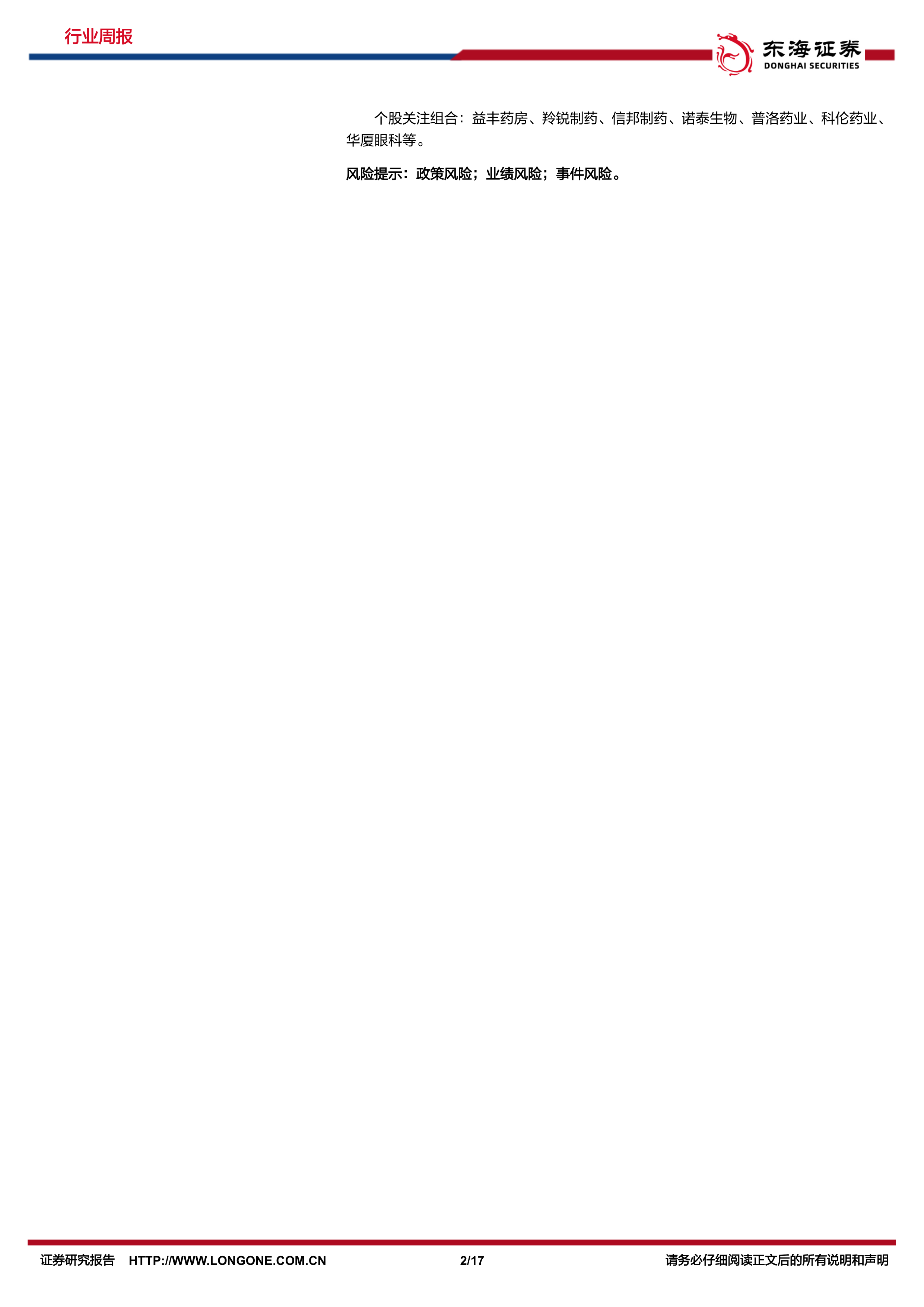 报告还提供了具体的个股推荐组合(博雅生物、特宝生物、百诚医药、贝达药业、老百姓、丽珠集团、康泰生物)和个股关注组合(益丰药房、羚锐制药、信邦制药、诺泰生物、普洛药业、科伦药业、华厦眼科等)。同时,报告提示了政策风险、业绩风险和事件风险。