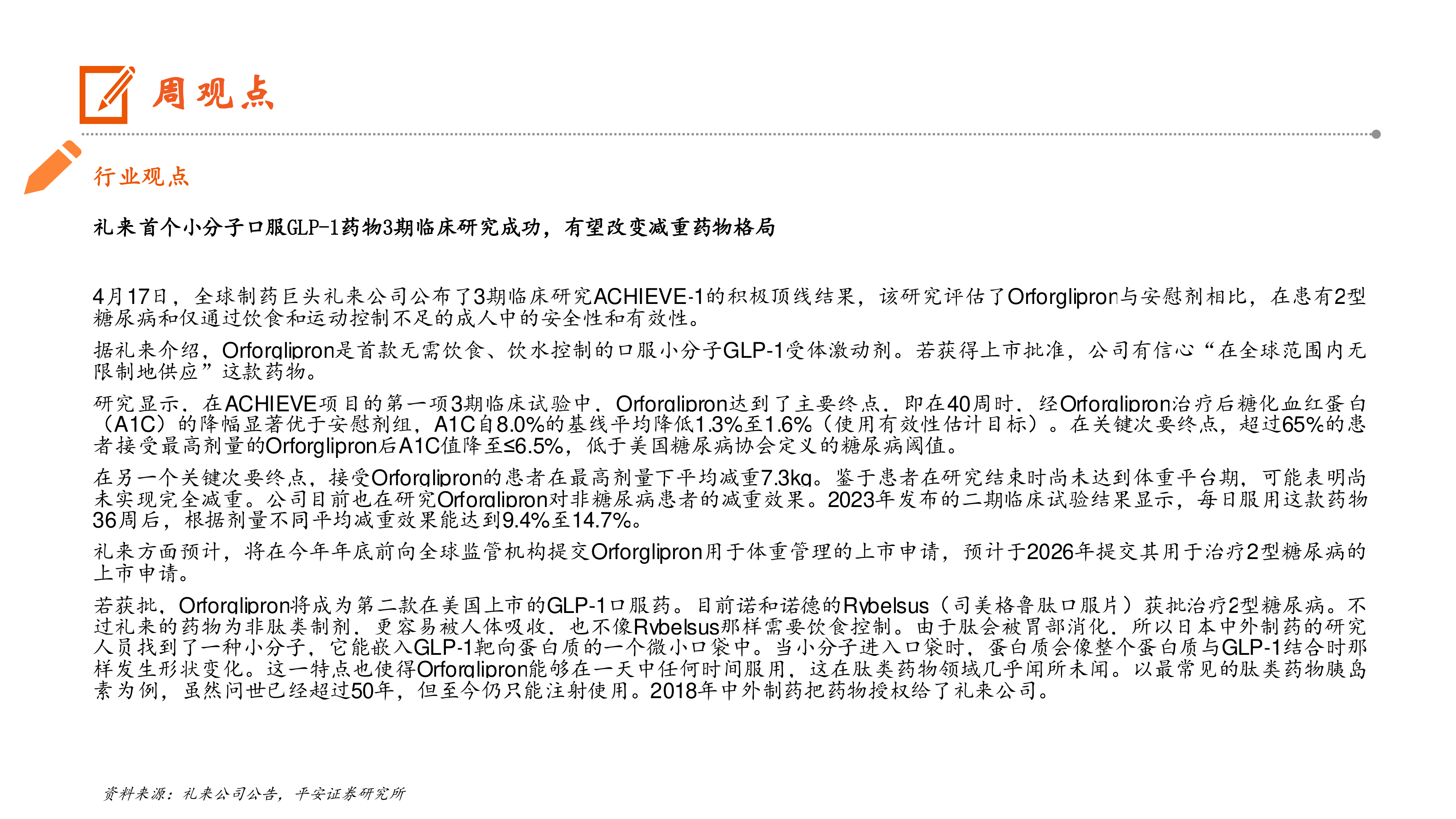 生物医药行业:礼来首个小分子口服GLP-1药物3期临床研究成功,有望改变减重药物格局