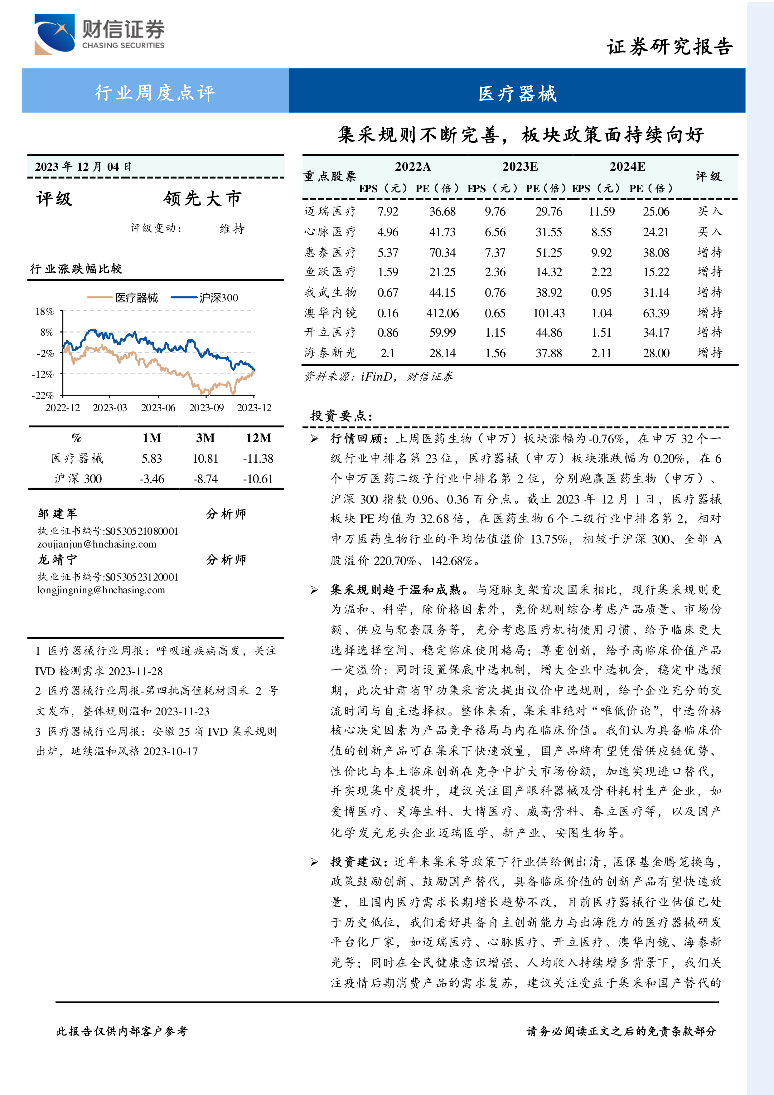 本报告分析了近期医疗器械行业的政策和市场动态,指出集采规则日趋完善,更加注重产品质量和创新,而非单纯的价格竞争。这为具备临床价值的创新产品和具有供应链优势的国产品牌提供了发展机遇。同时,国内医疗需求长期增长趋势不变,医疗器械行业估值已处于历史低位,具备自主创新能力和出海能力的医疗器械企业值得关注。