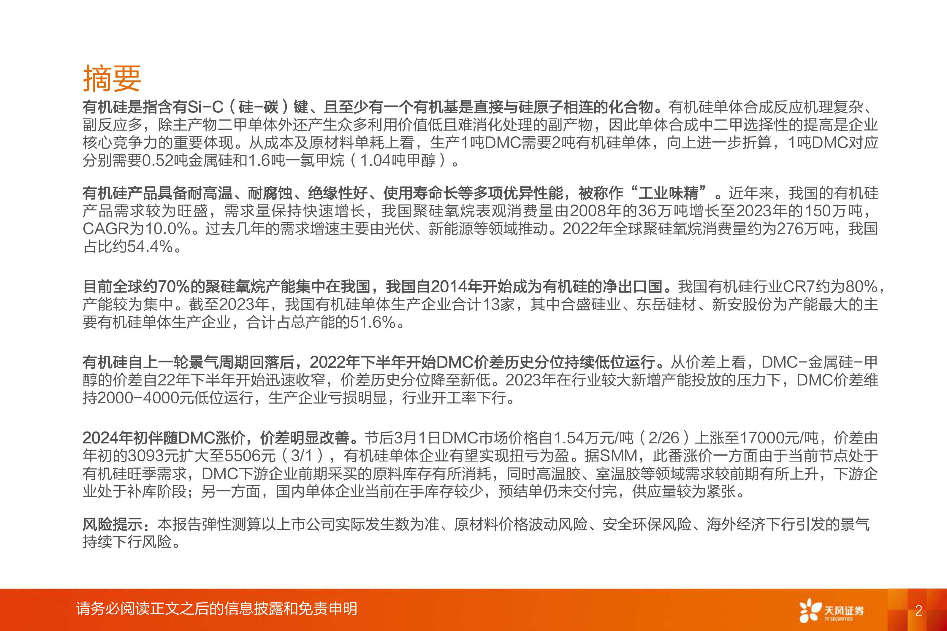 本报告全面分析了有机硅行业的基本面情况,包括产品概况、下游应用、贸易情况、供给情况、价格走势以及上市公司弹性测算。报告指出,有机硅行业受益于下游需求增长,但同时也面临产能扩张和原材料价格波动等风险。DMC价差是衡量行业盈利能力的关键指标,2024年初伴随DMC涨价,行业景气度有望回升。投资者应关注行业龙头企业,并注意防范相关风险。