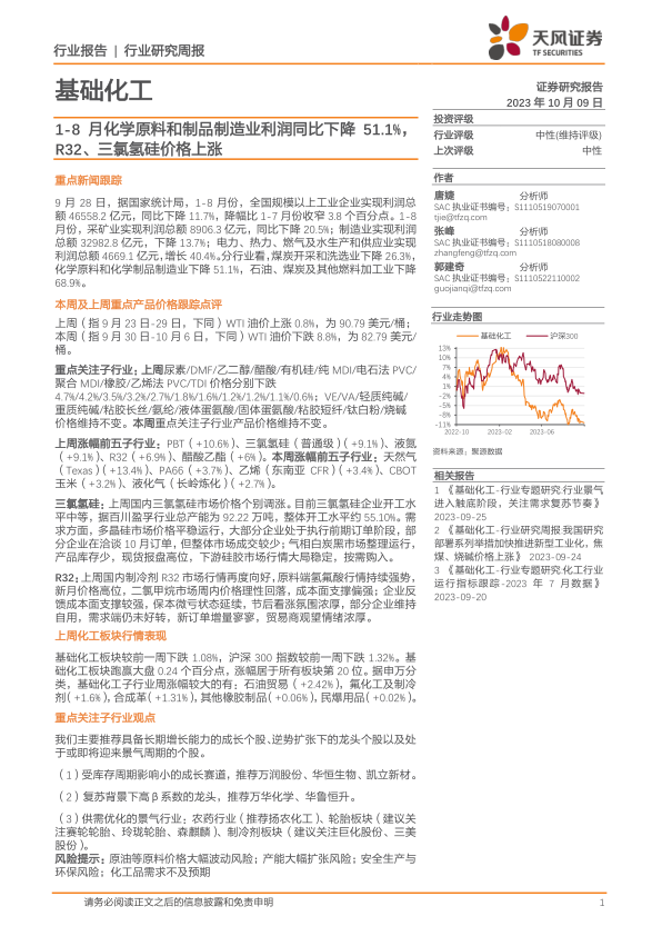 基础化工行业研究周报:1-8月化学原料和制品制造业利润同比下降51.1%,R32、三氯氢硅价格上涨