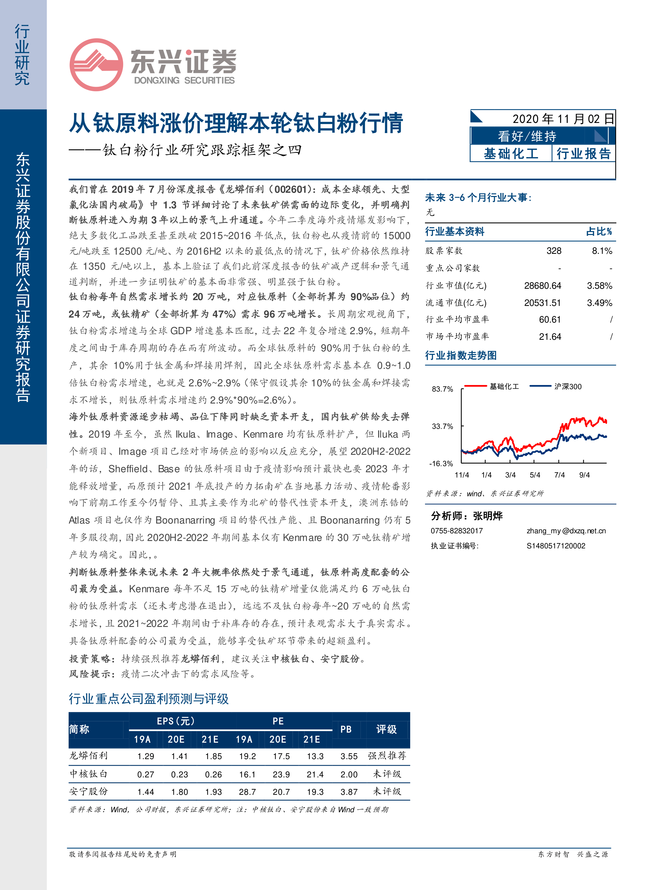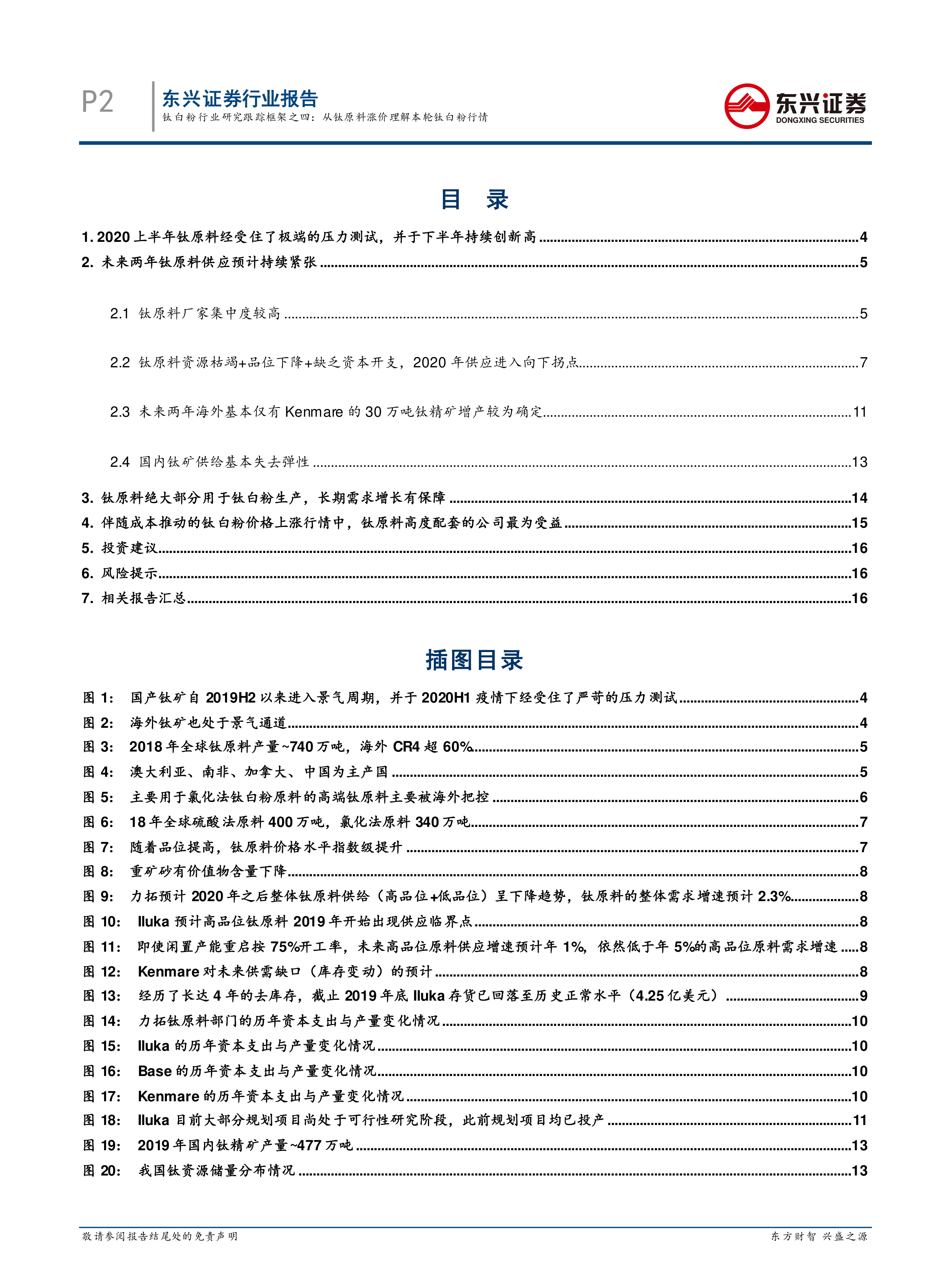 我们曾在 2019 年 7 月份深度报告《龙蟒佰利( 002601):成本全球领先、大型氯化法国内破局》中 1.3 节详细讨论了未来钛矿供需面的边际变化,并明确判断钛原料进入为期 3 年以上的景气上升通道。 今年二季度海外疫情爆发影响下,绝大多数化工品跌至甚至跌破 2015~2016 年低点, 钛白粉也从疫情前的 15000元/吨跌至 12500 元/吨、为 2016H2 以来的最低点的情况下,钛矿价格依然维持在 1350 元/吨以上,基本上验证了我们此前深度报告的钛矿减产逻辑和景气通道判断,并进一步证明钛矿的基本面非常强、明显强于钛白粉。
