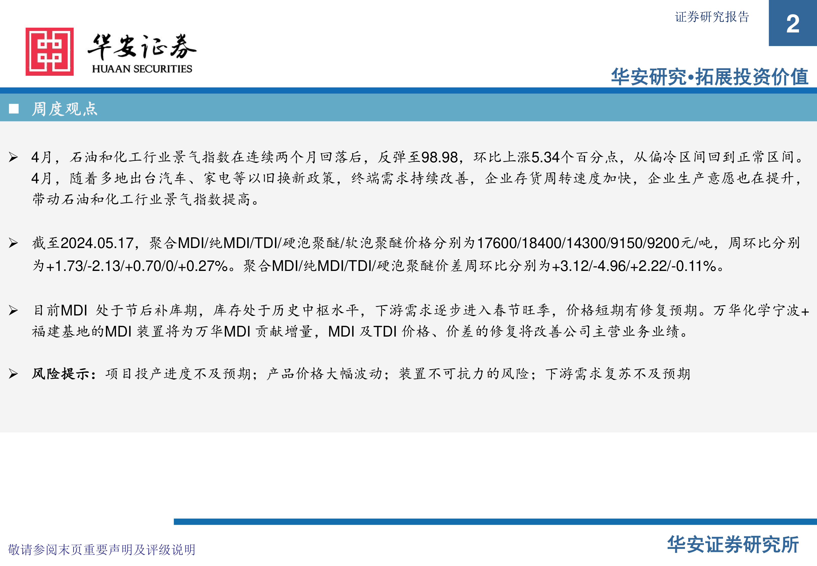 本报告核心观点指出,在2024年5月11日至5月17日期间,石油和化工行业景气指数在连续两个月回落后显著反弹,从偏冷区间回归正常,显示出市场信心的恢复和终端需求的改善。特别是聚合MDI产品,其价格和价差均呈现小幅改善,预示着MDI市场正逐步进入节后补库期,并有望在下游需求旺季的带动下进一步修复。万华化学作为行业龙头,其宁波和福建MDI装置的增量贡献,以及MDI和TDI价格及价差的修复,预计将对其主营业务业绩产生积极影响。