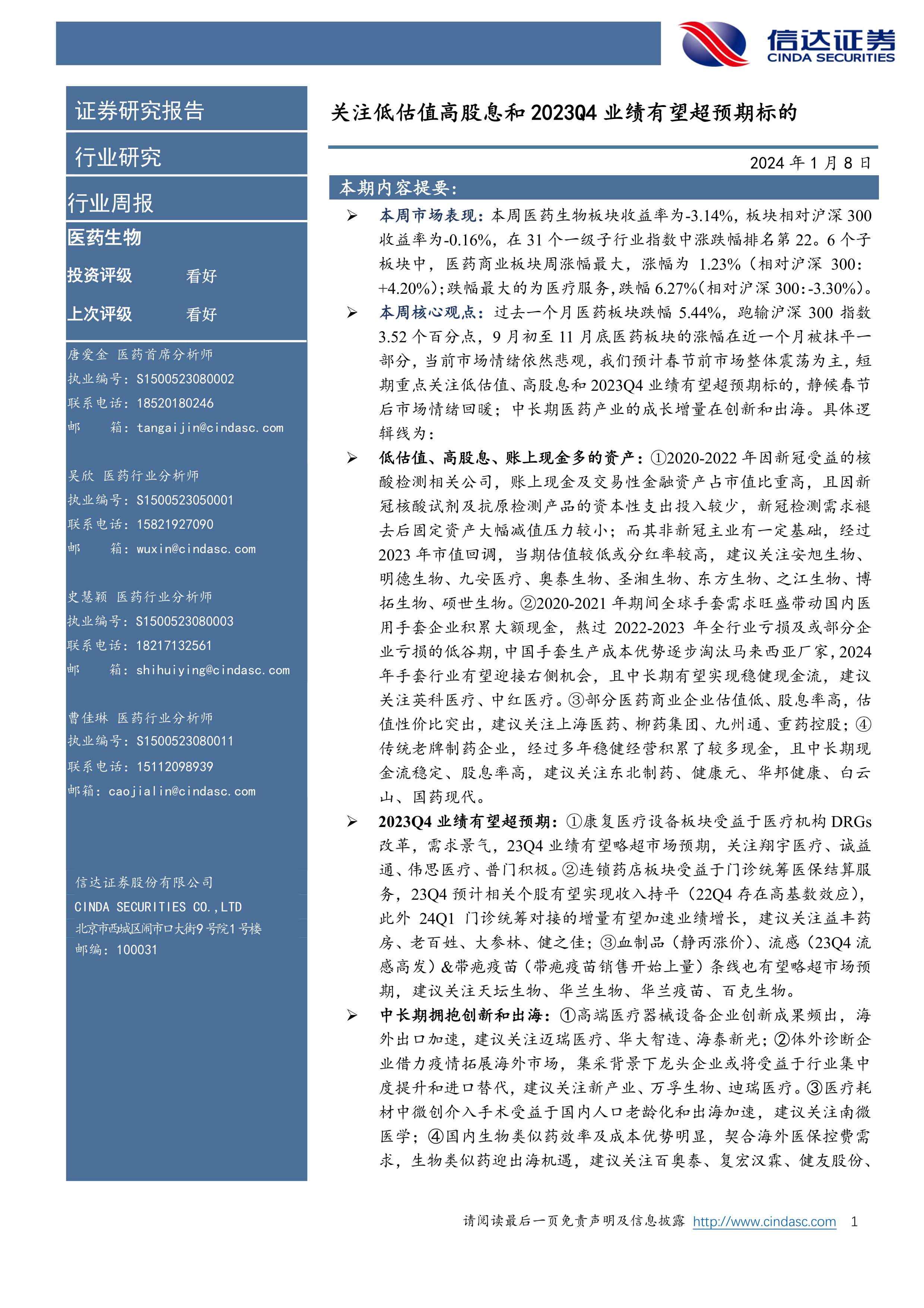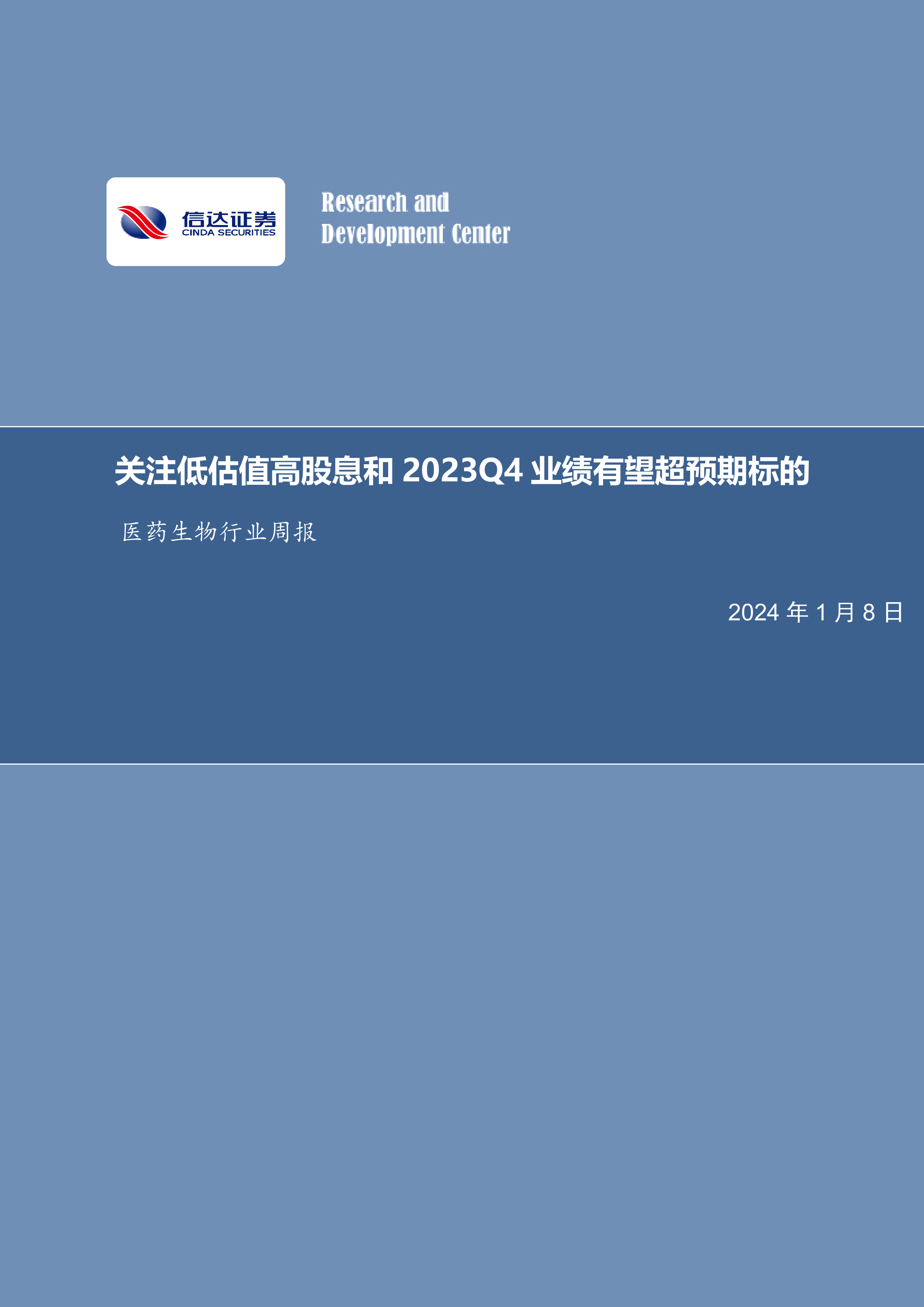 医药生物行业周报:关注低估值高股息和2023Q4业绩有望超预期标的