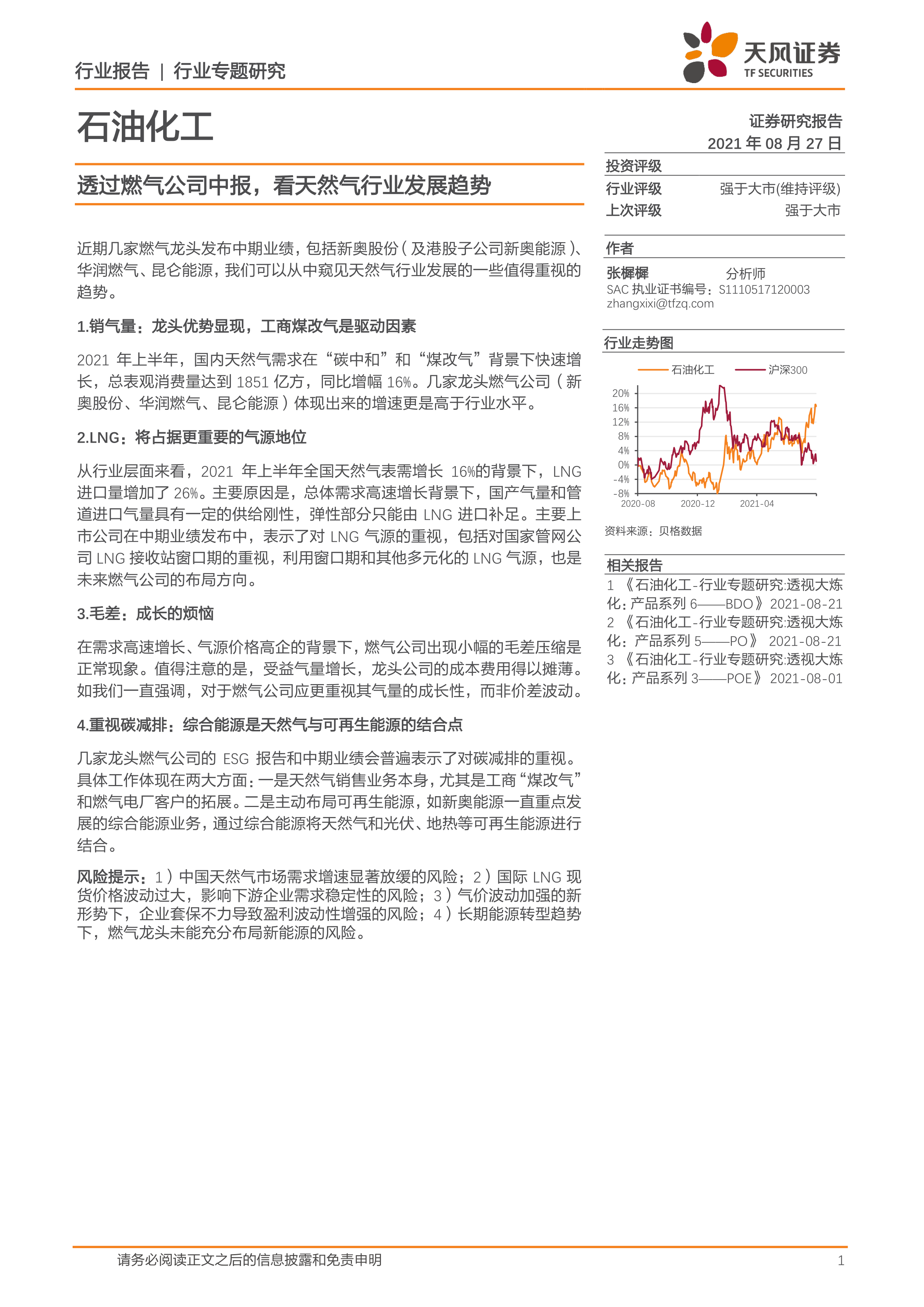 石油化工行业专题研究:透过燃气公司中报,看天然气行业发展趋势