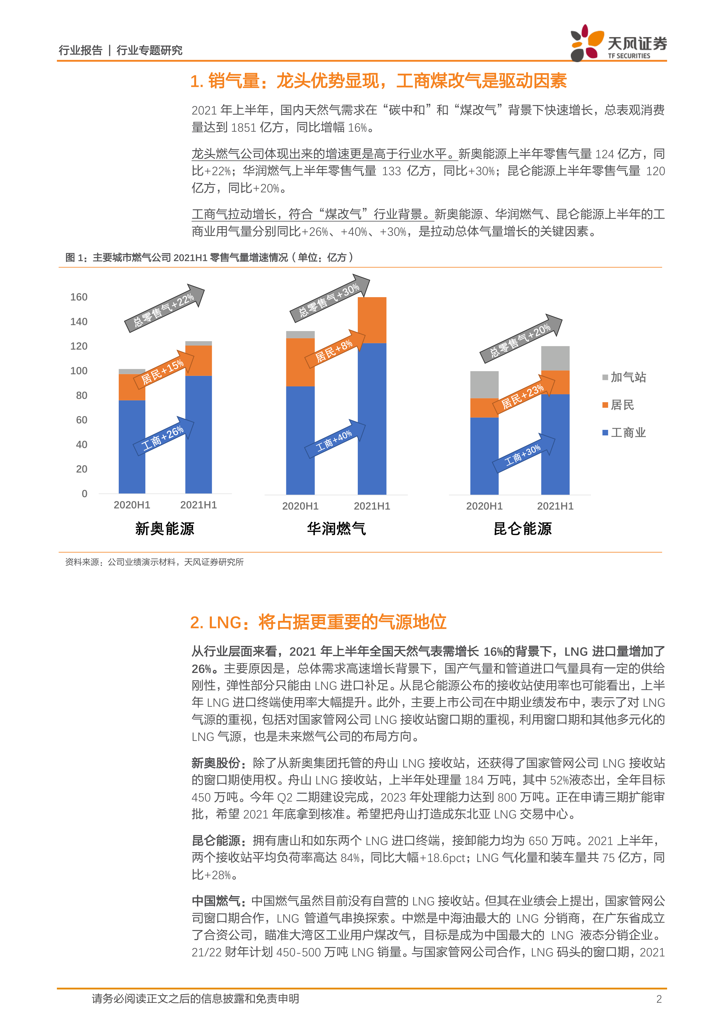 2021年上半年,国内天然气需求在“碳中和”和“煤改气”背景下快速增长,总表观消费量达到1851亿方,同比增幅16%。几家龙头燃气公司(新奥股份、华润燃气、昆仑能源)体现出来的增速更是高于行业水平。