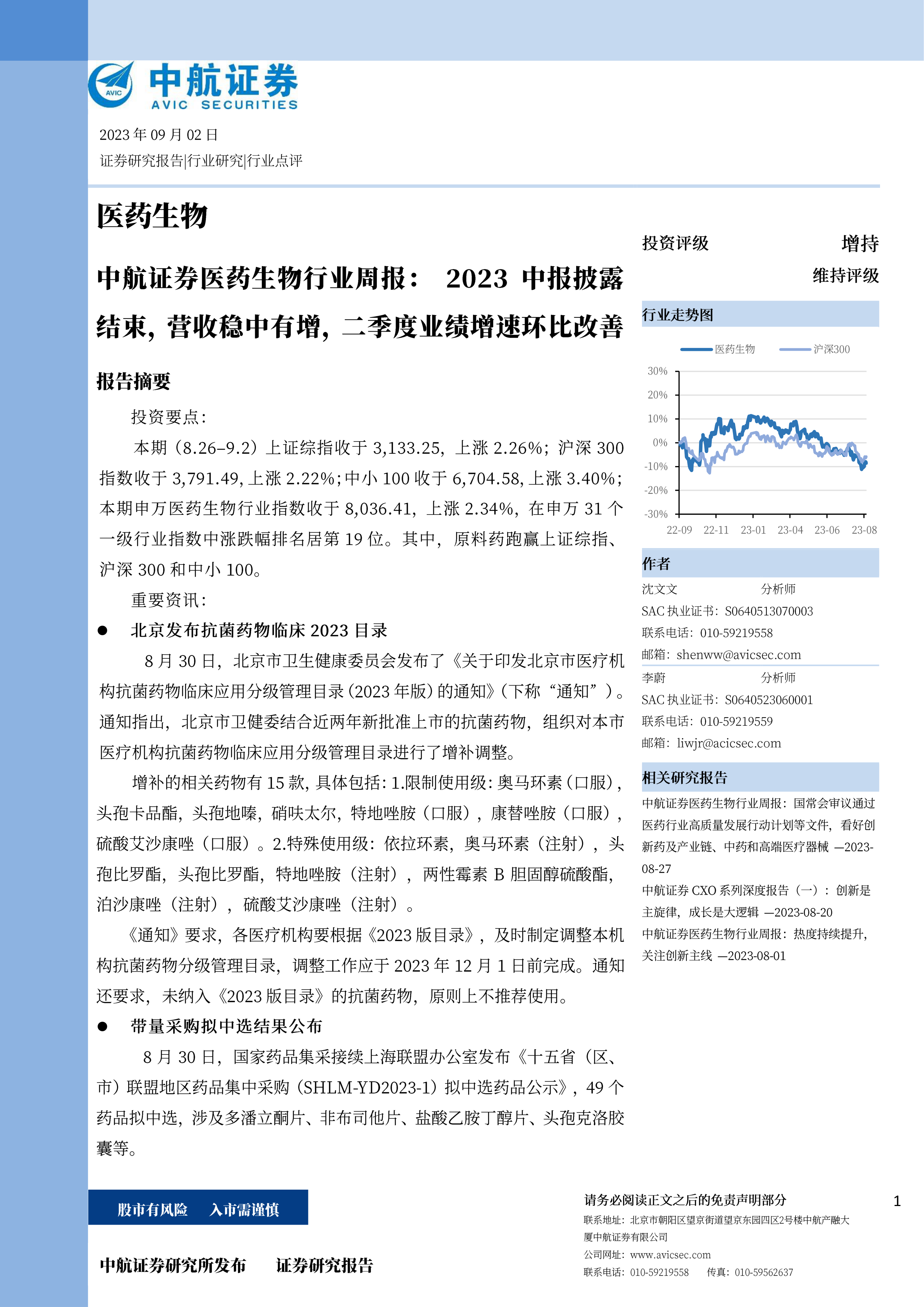 医药生物行业周报:2023中报披露结束,营收稳中有增,二季度业绩增速环比改善