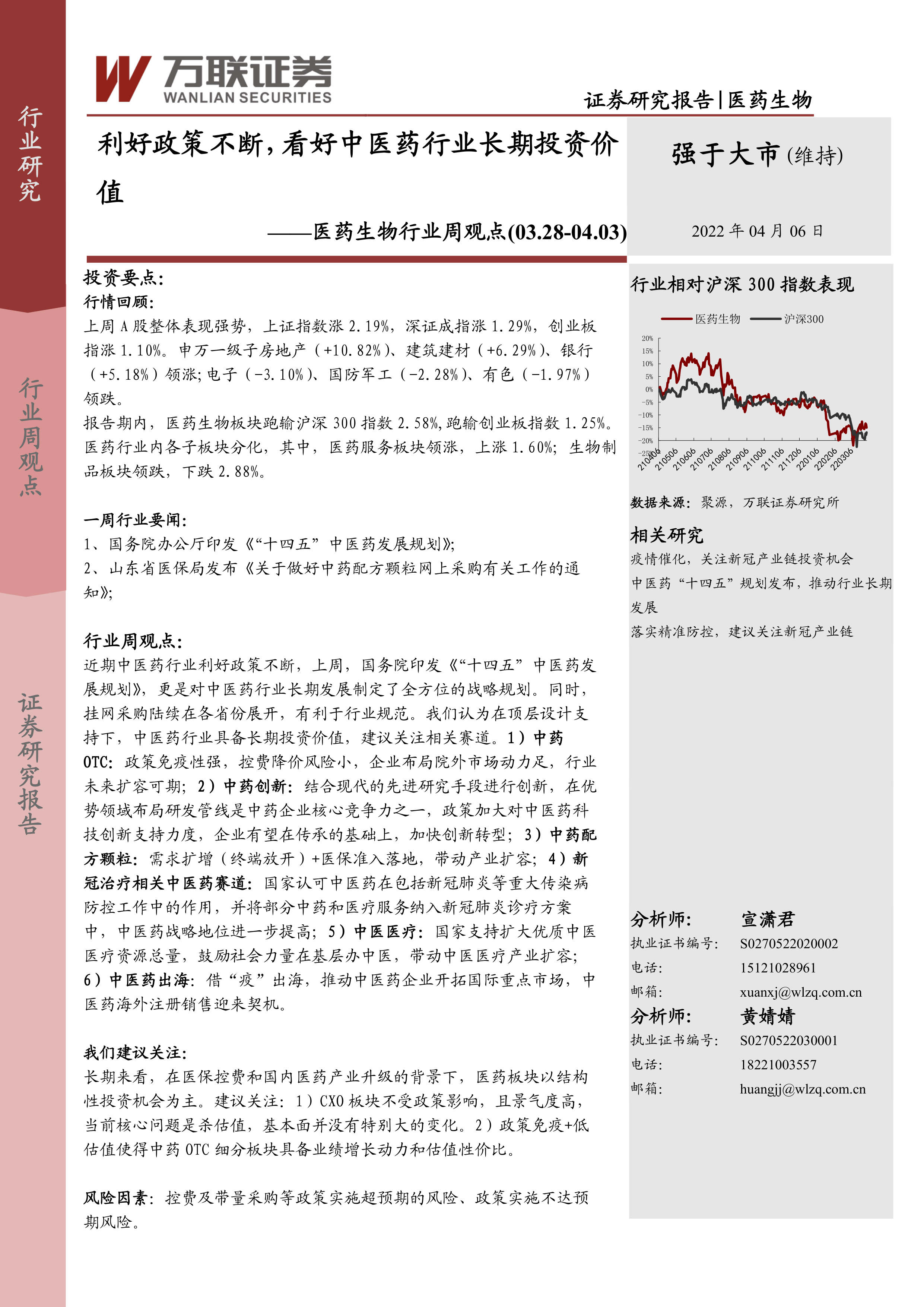 本报告分析了医药生物行业的近期市场表现和热点事件,重点关注了《“十四五”中医药发展规划》和中药配方颗粒网上采购等政策对行业的影响。报告认为,在政策利好的驱动下,中医药行业具备长期投资价值,但同时也应关注医保控费和带量采购等政策带来的风险。在医药产业升级的背景下,医药板块将呈现结构性投资机会,CXO和中药OTC细分板块值得重点关注。
