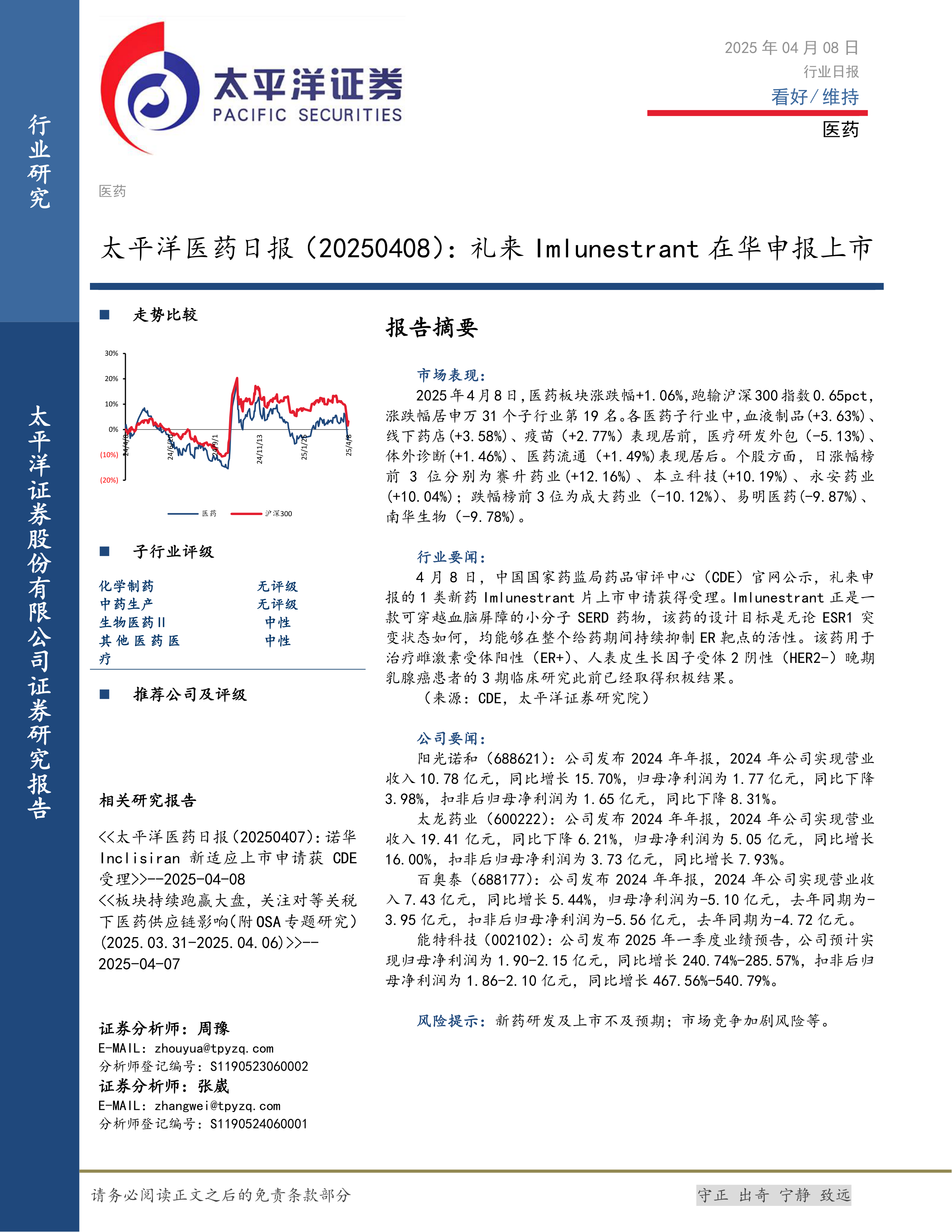 本报告分析了2025年4月8日医药板块的市场表现,重点关注了礼来公司新药Imlunestrant在华申报上市的事件,并跟踪了阳光诺和、太龙药业、百奥泰和能特科技等公司的业绩情况。医药板块整体上涨但跑输大盘,子行业和个股表现分化。礼来新药的申报上市有望为乳腺癌患者带来新的治疗选择。各公司业绩表现不一,投资者需关注其具体经营情况和未来发展。