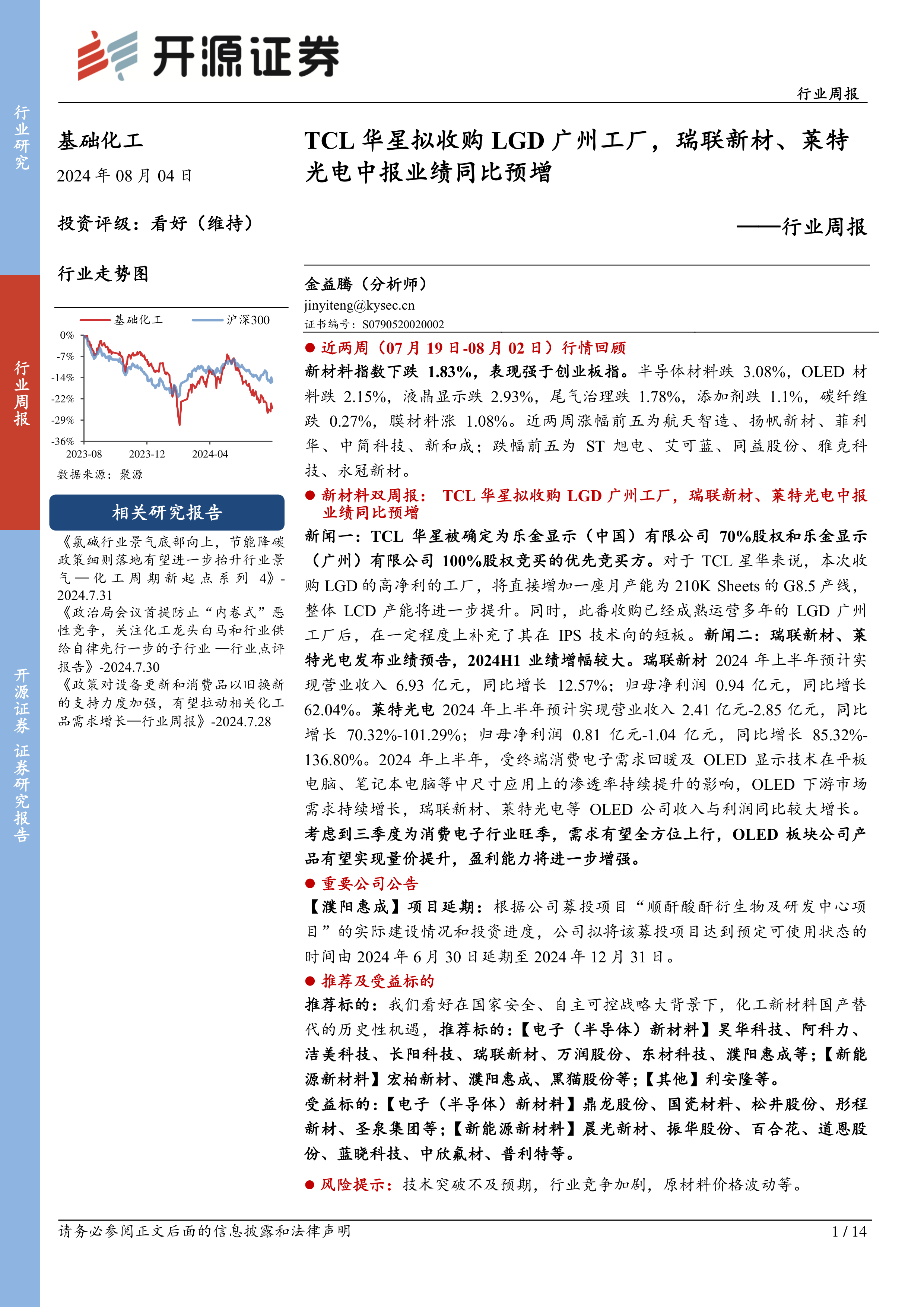 基础化工行业周报:TCL华星拟收购LGD广州工厂,瑞联新材、莱特光电中报业绩同比预增
