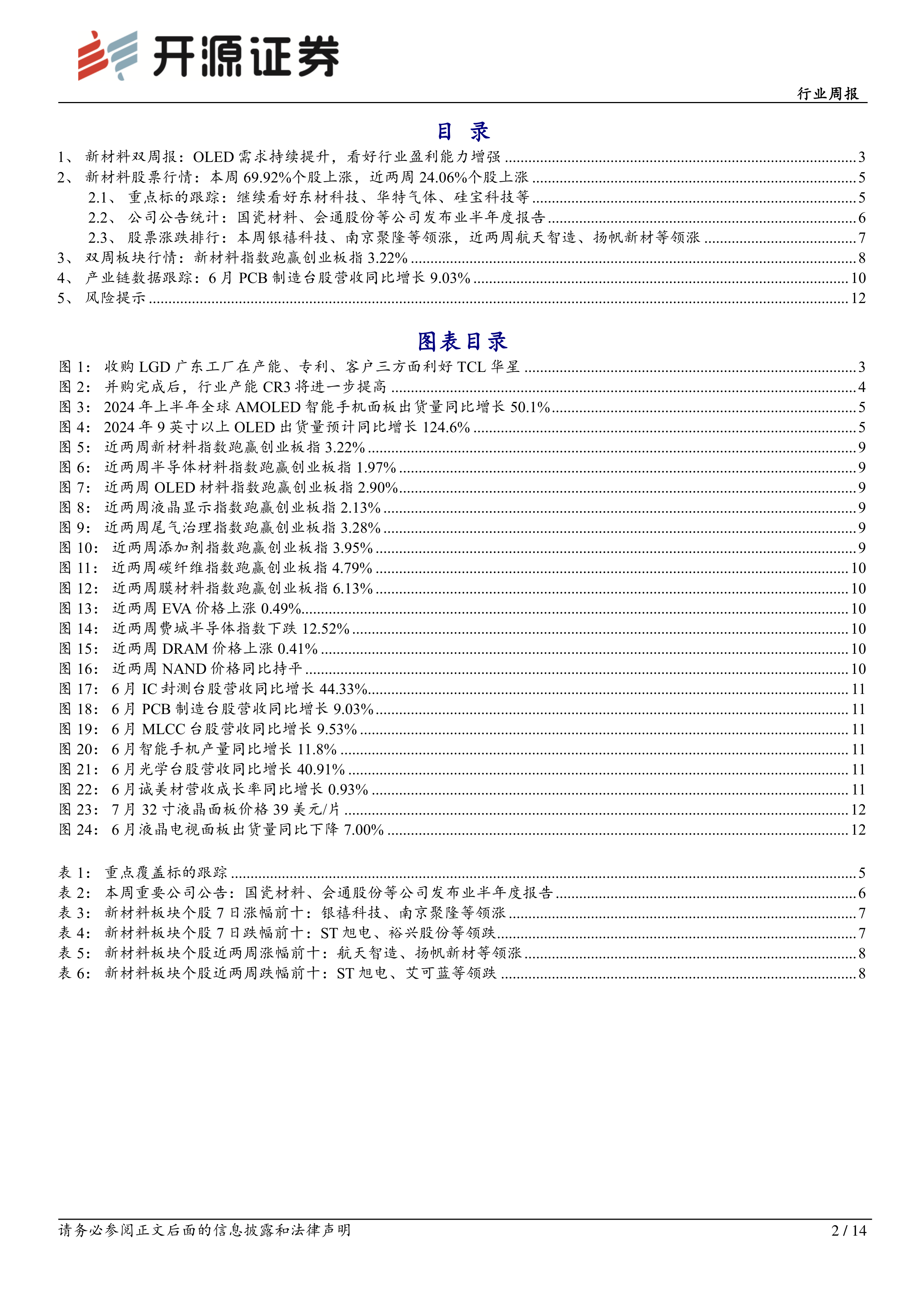 新闻一:TCL华星被确定为乐金显示(中国)有限公司70%股权和乐金显示(广州)有限公司100%股权竞买的优先竞买方。对于TCL星华来说,本次收购LGD的高净利的工厂,将直接增加一座月产能为210K Sheets的G8.5产线,整体LCD产能将进一步提升。同时,此番收购已经成熟运营多年的LGD广州工厂后,在一定程度上补充了其在IPS技术向的短板。新闻二:瑞联新材、莱特光电发布业绩预告,2024H1业绩增幅较大。瑞联新材2024年上半年预计实现营业收入6.93亿元,同比增长12.57%;归母净利润0.94亿元,同比增长62.04%。莱特光电2024年上半年预计实现营业收入2.41亿元-2.85亿元,同比增长70.32%-101.29%;归母净利润0.81亿元-1.04亿元,同比增长85.32%-136.80%。2024年上半年,受终端消费电子需求回暖及OLED显示技术在平板电脑、笔记本电脑等中尺寸应用上的渗透率持续提升的影响,OLED下游市场需求持续增长,瑞联新材、莱特光电等OLED公司收入与利润同比较大增长。考虑到三季度为消费电子行业旺季,需求有望全方位上行,OLED板块公司产品有望实现量价提升,盈利能力将进一步增强。