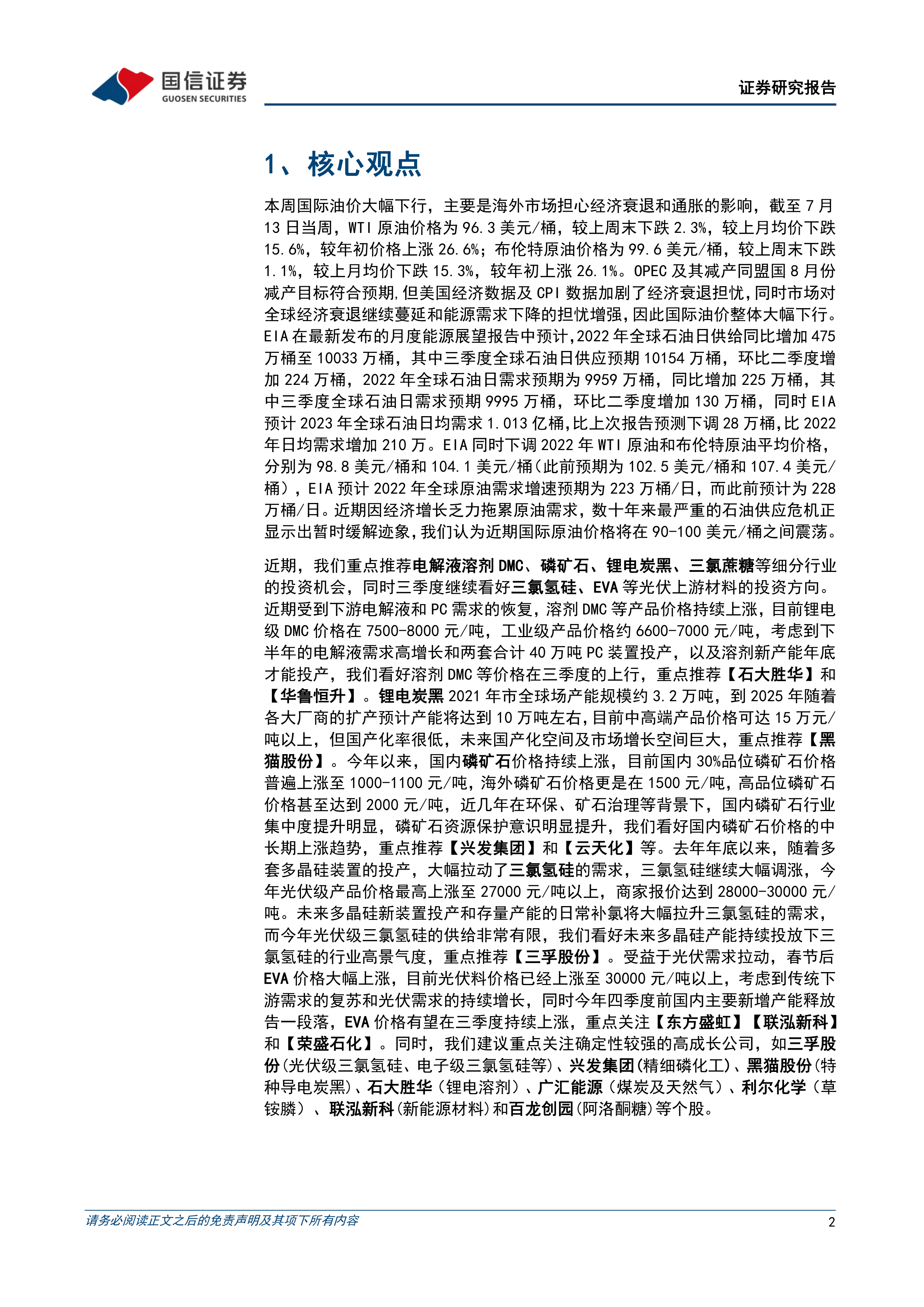 报告重点推荐电解液溶剂DMC、磷矿石、锂电炭黑、三氯蔗糖等细分行业,并持续看好三氯氢硅、EVA等光伏上游材料在三季度的投资方向。这些领域受益于下游需求高增长、供给紧缺或国产化替代空间巨大,相关龙头企业有望持续受益。