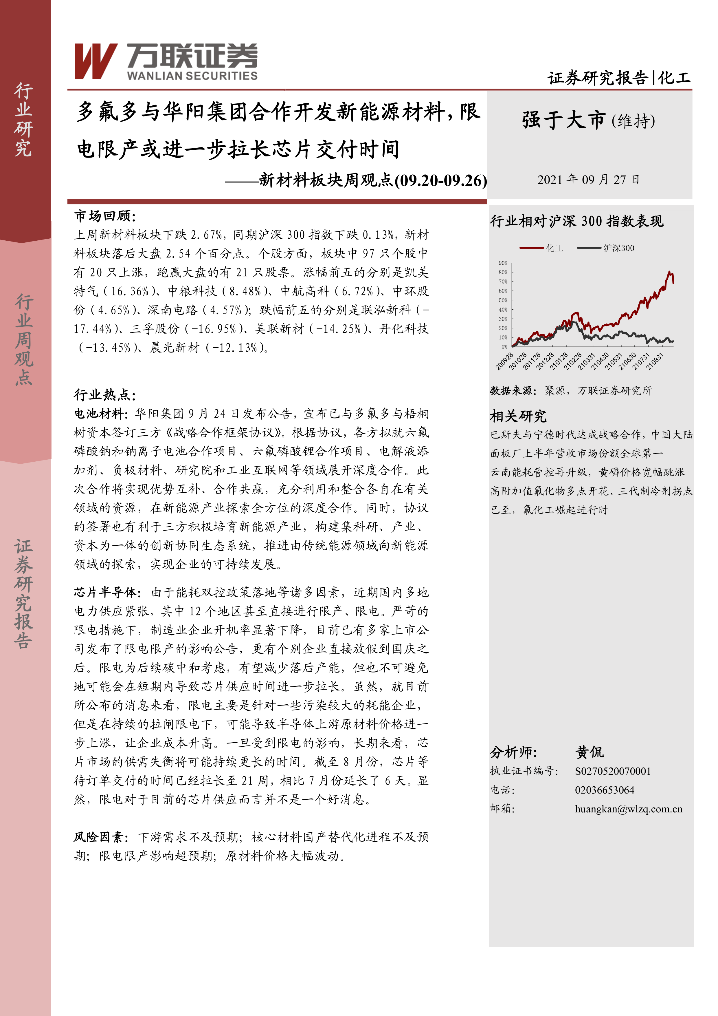 本报告分析了新材料板块在2021年9月20日至9月26日期间的市场表现、行业热点、公司动态及投资策略。上周新材料板块整体表现弱于大盘,下跌2.67%。行业热点集中在新能源材料和芯片半导体领域。电池材料方面,多氟多与华阳集团达成战略合作,共同开发六氟磷酸钠/锂、钠离子电池等新能源材料,旨在构建创新协同生态系统。芯片半导体方面,受能耗双控政策影响,多地限电限产导致芯片交付时间延长至21周,较上月增加6天,并可能推高原材料价格,加剧供需失衡。报告还详细跟踪了丹化科技、银禧科技、中粮科技、丹邦科技等公司的最新项目进展,以及万润股份、瑞联新材、奥来德等覆盖公司的上半年业绩表现和战略布局。投资策略建议关注新能源材料领域的合作机遇,同时警惕限电限产对芯片半导体供应链带来的风险。主要风险因素包括下游需求、国产替代进程、限电影响及原材料价格波动。