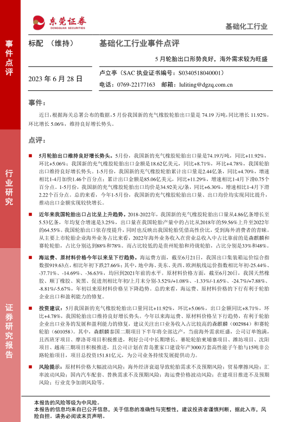 基础化工行业事件点评:5月轮胎出口形势良好,海外需求较为旺盛
